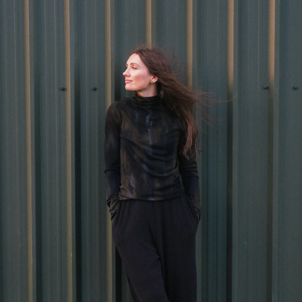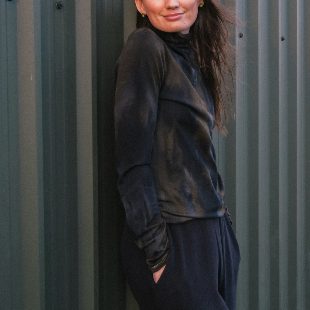 A soft, easy-fitting high-neck top with gentle draping and a unique washed finish. Stylish, comfortable, and perfect for everyday wear.