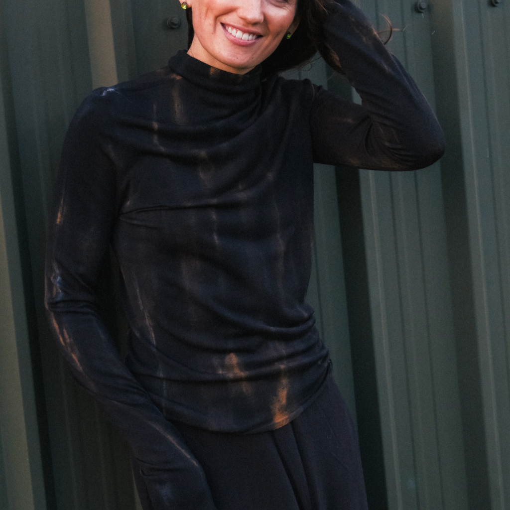 A soft, easy-fitting high-neck top with gentle draping and a unique washed finish. Stylish, comfortable, and perfect for everyday wear.