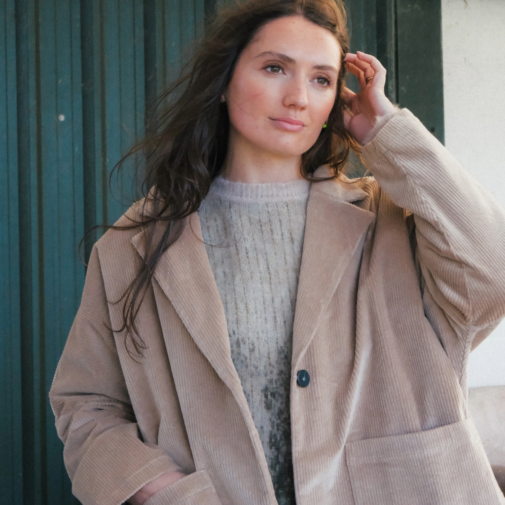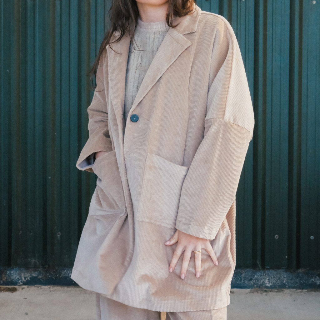 An oversized corduroy jacket with a relaxed, easy fit. Designed with a classic collar and lapels, drop shoulders, long sleeves, front button closure, and roomy patch pockets. Unlined for a soft, effortless feel.