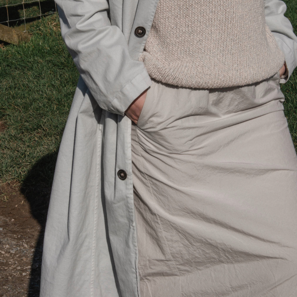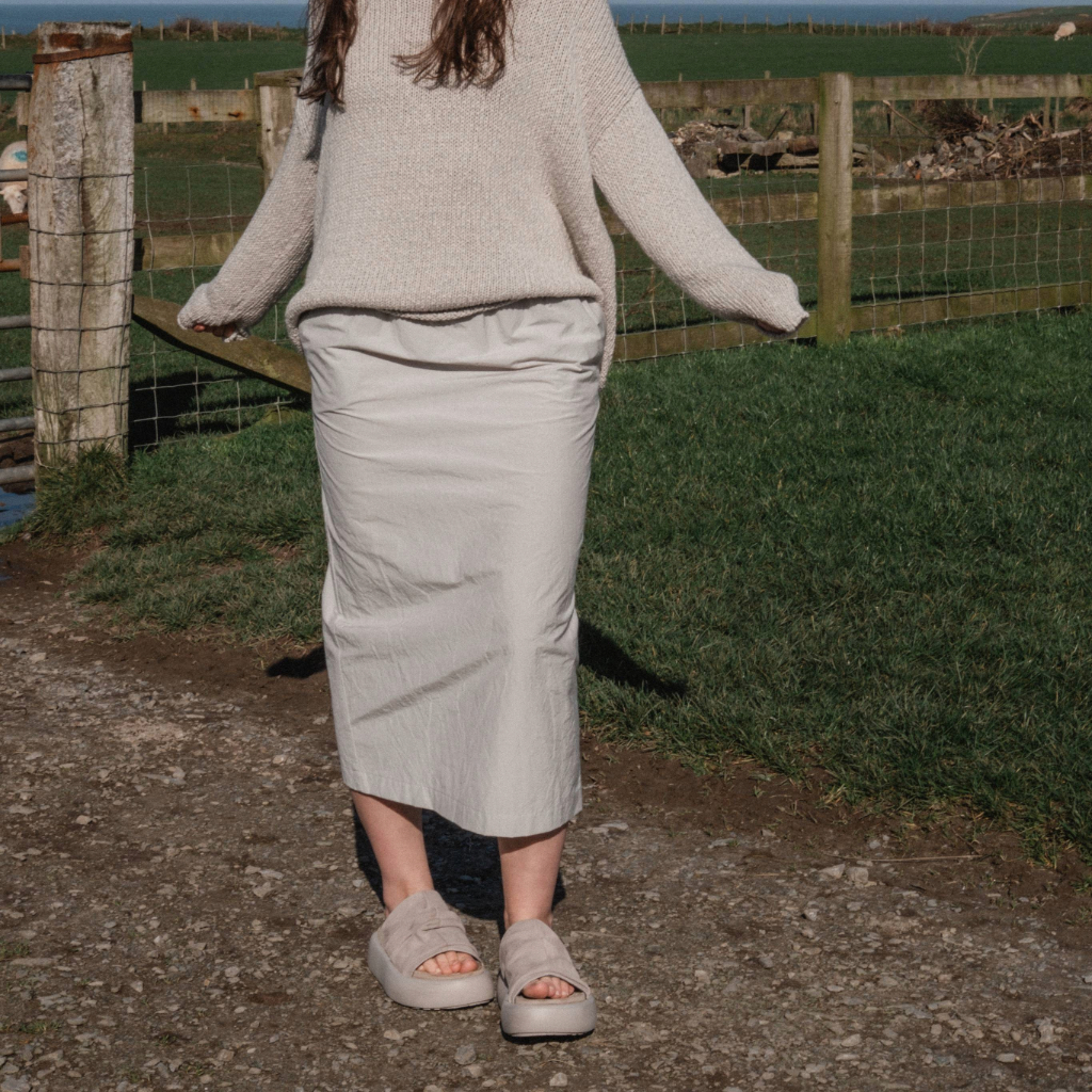 A comfortable cotton midi skirt with a flattering pencil silhouette, elasticated waist, and pockets. Hits mid-calf for a versatile, everyday look.