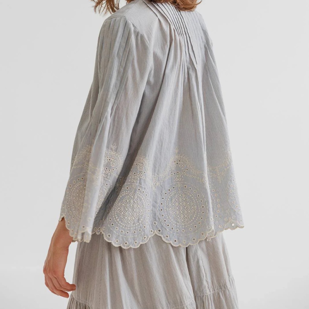 A striped fine cotton shirt with pleats on front, back and upper sleeves. Along with the rund neck there is a buttoned placket. The shirt has decorative embroideries at hem and scalloped edging. The light voile quality gives the shirt an airy feel.