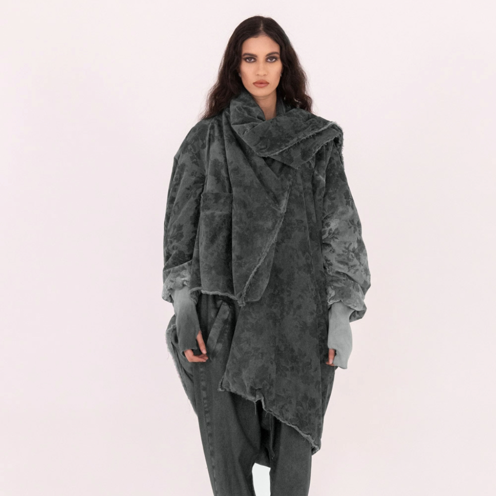 A midi-length asymmetric puffer coat made from soft cotton velvet. It features a distinctive stole-style collar with a corroded camellia print and is finished with a cool-dye treatment for a unique, textured effect.