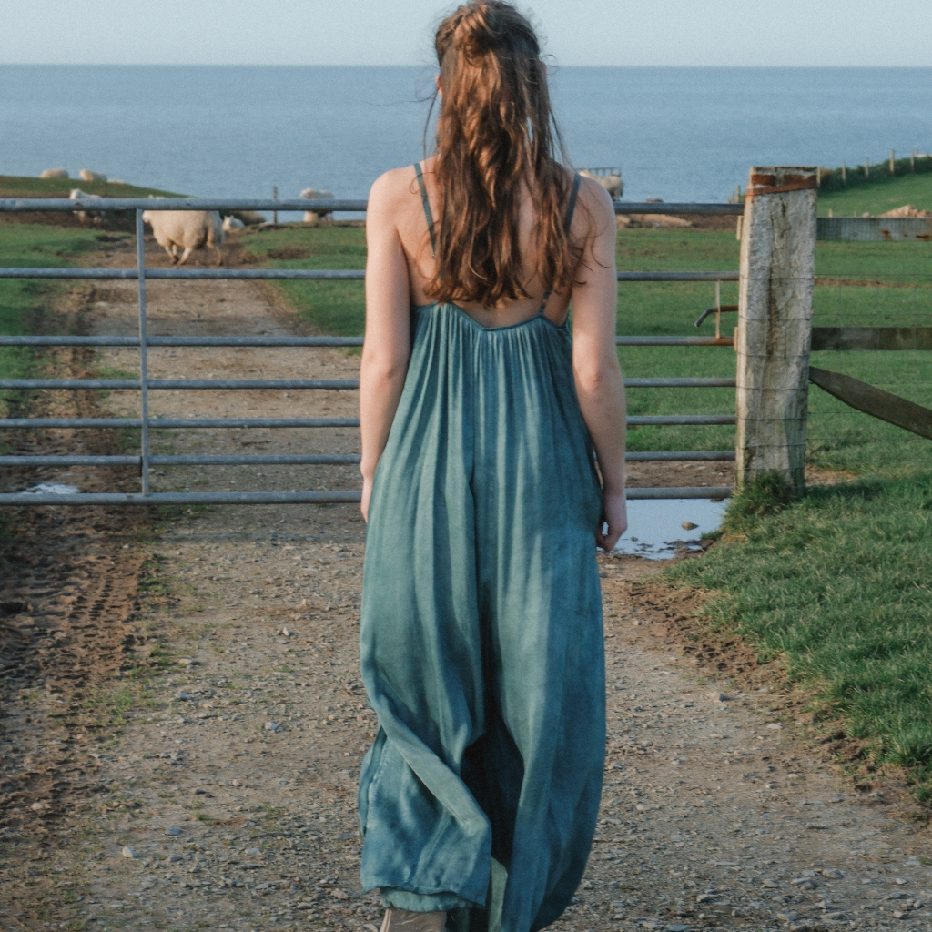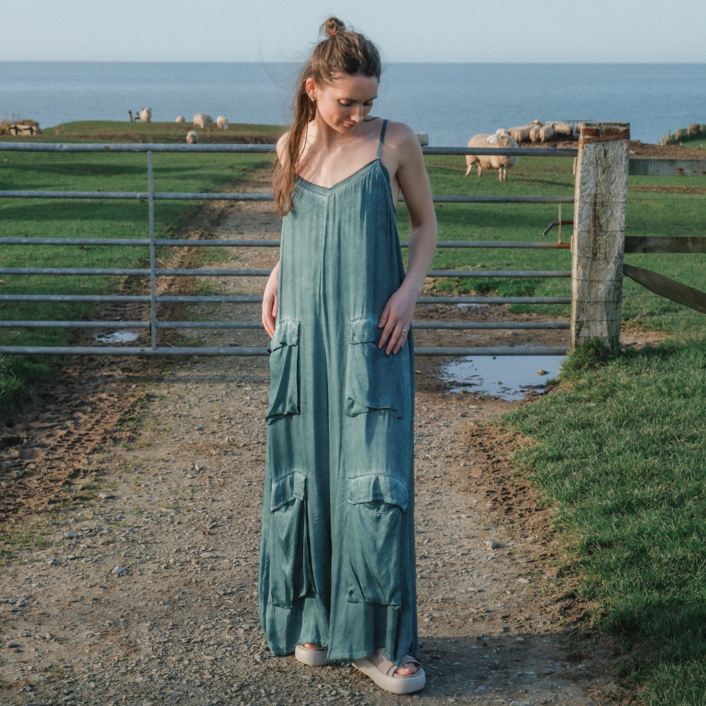 Wide palazzo jumpsuit in lightweight cargo viscose satin with four pockets and adjustable shoulder straps. Cold-dyed effect.