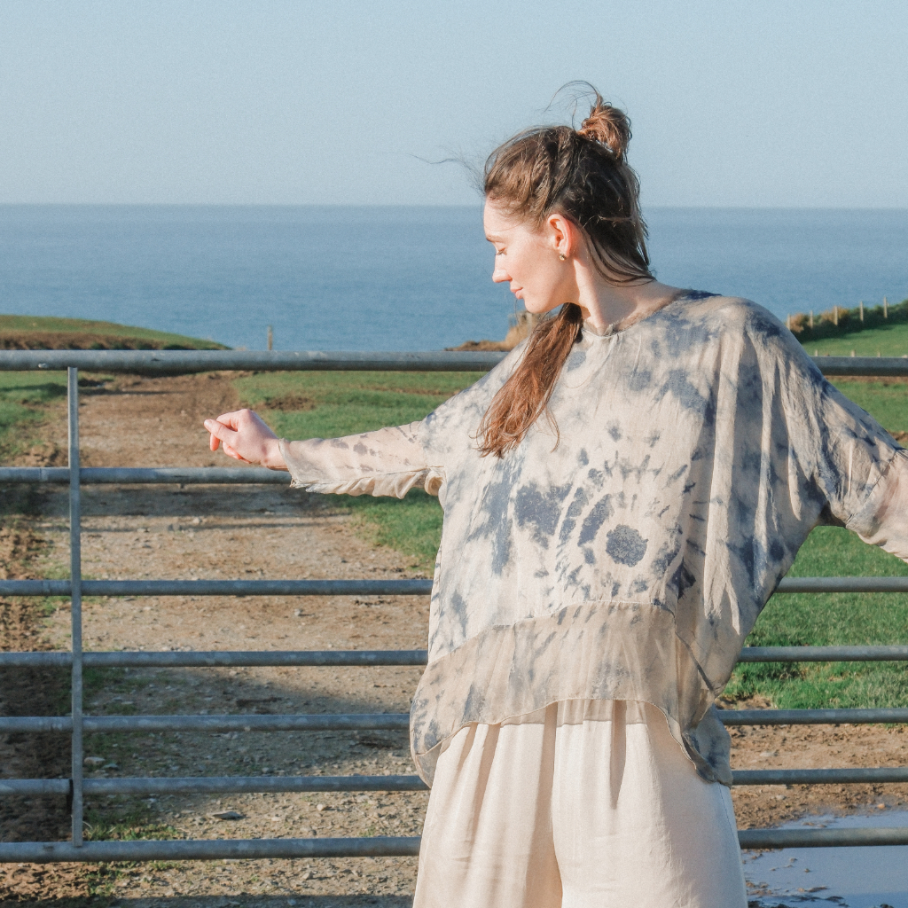 Boxy over V-neck t-shirt in light viscose satin with tie-and-dye printed silk-viscose sleeves and textured details. Cold-dyed effect.