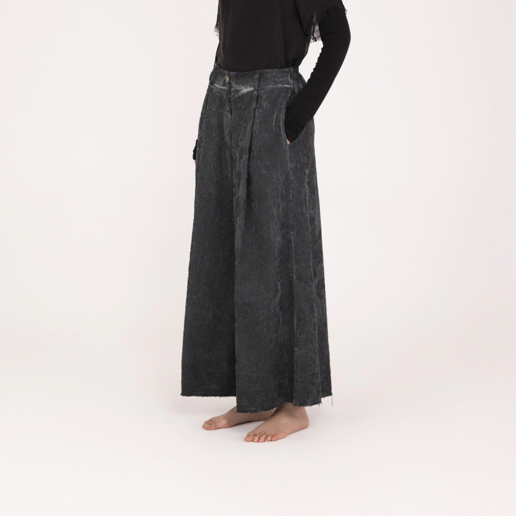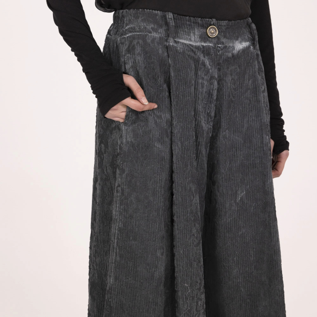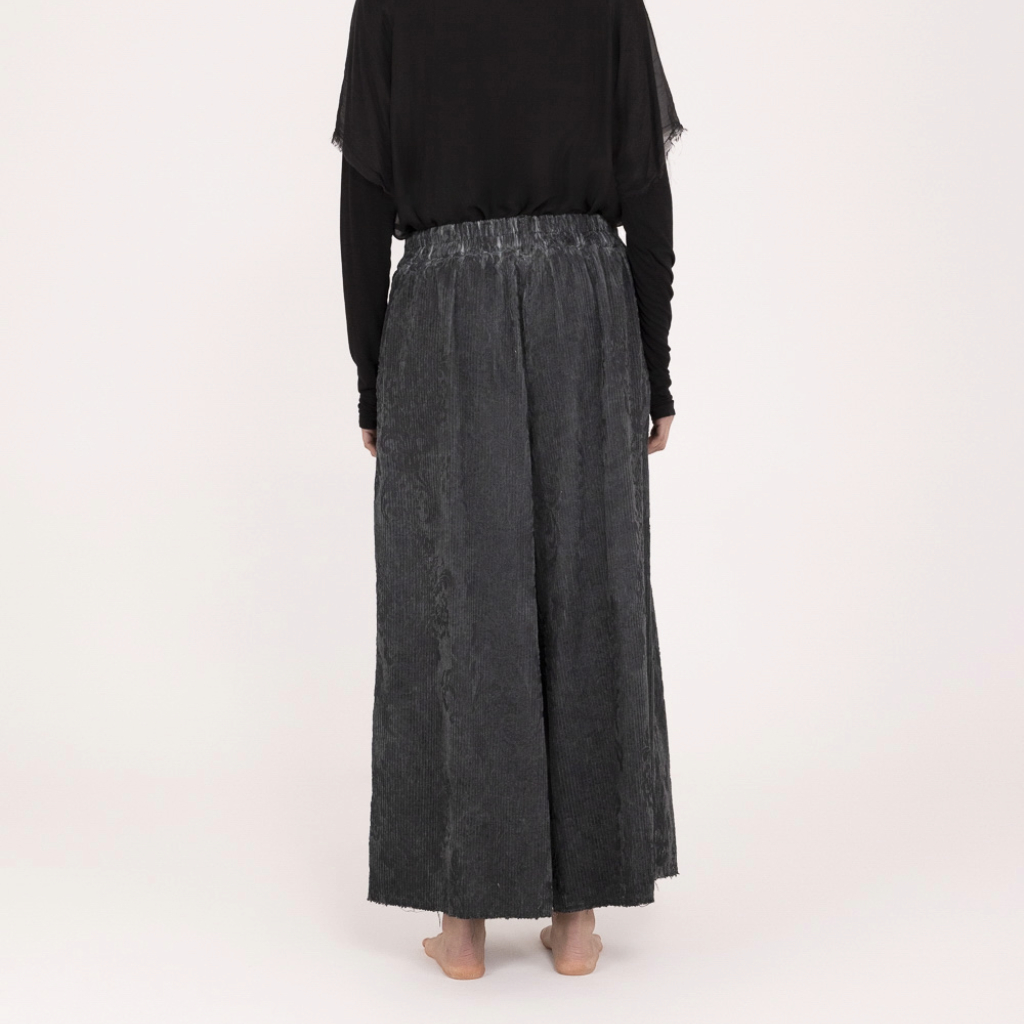 Palazzo trousers with an elasticated waist, made from cotton velvet with a corroded rococo-style print. Designed with a matching sash belt and viscose satin detailing, finished with a cool-dye treatment for a refined, textured look.