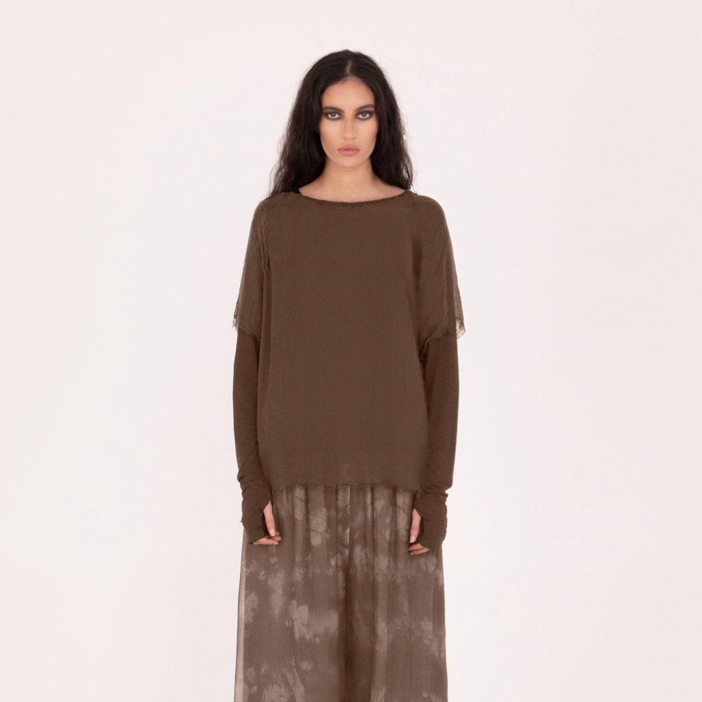 A crewneck, oversized top with raglan sleeves, featuring a layered construction in viscose-silk and viscose jersey. Long sleeves include thumbholes.