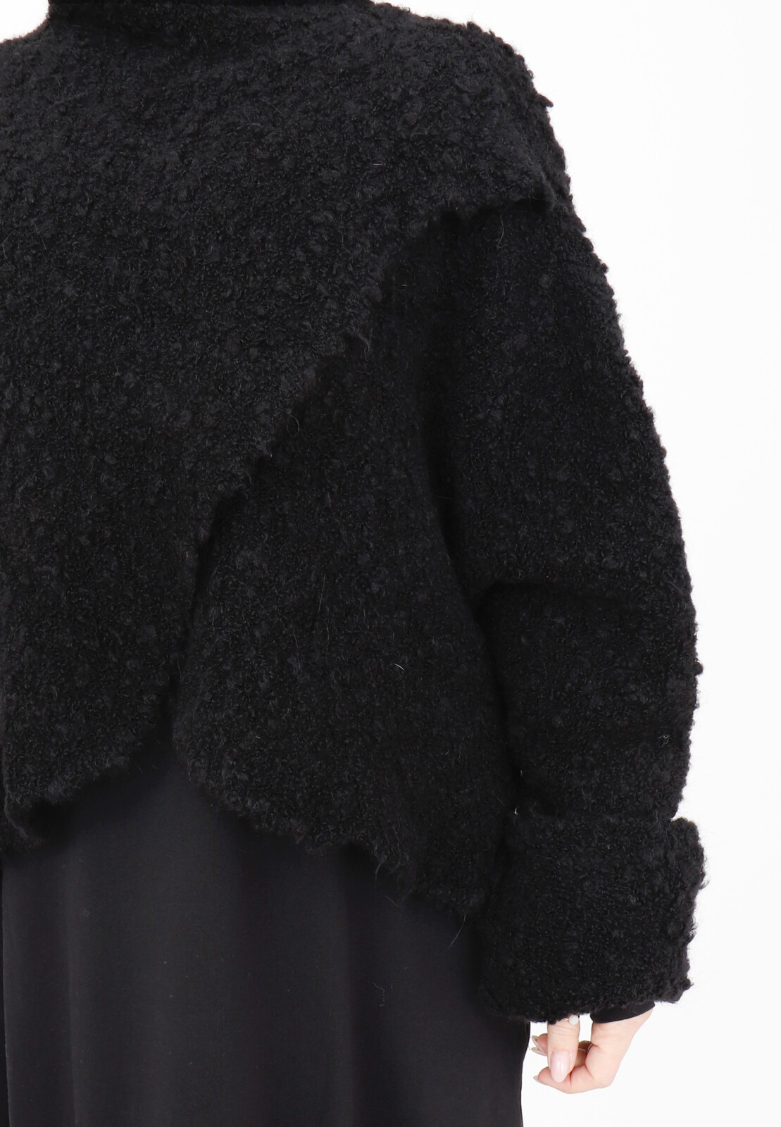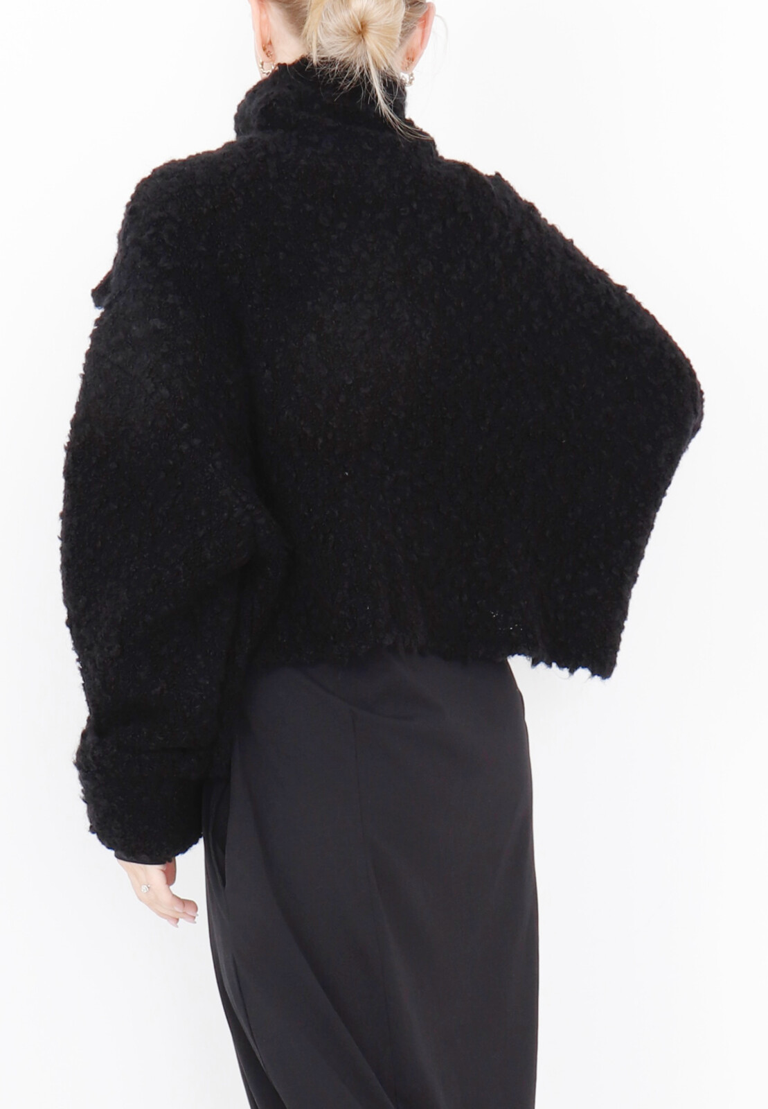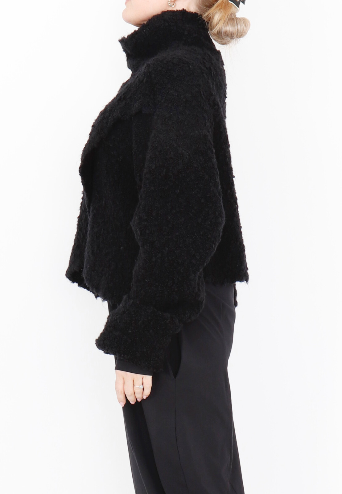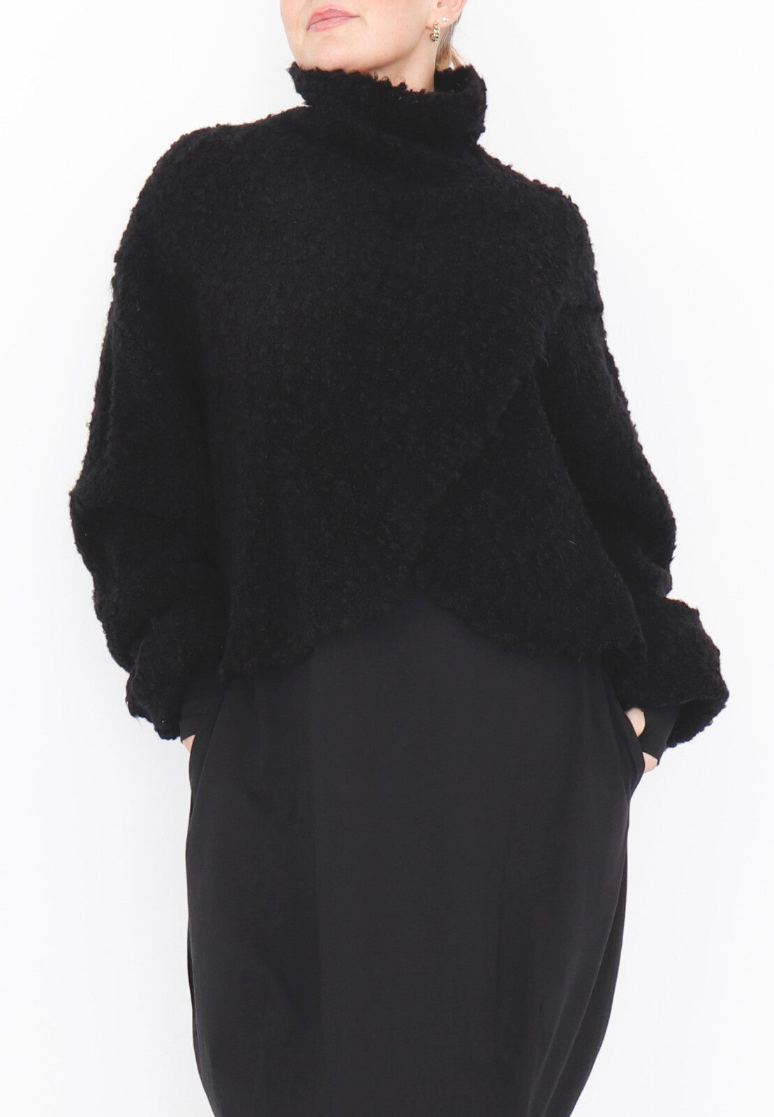 Sort Aarhus pullover in soft alpaca-wool bouclé, featuring a boxy fit, collar, and crossover front detail. Warm, durable, and timeless.