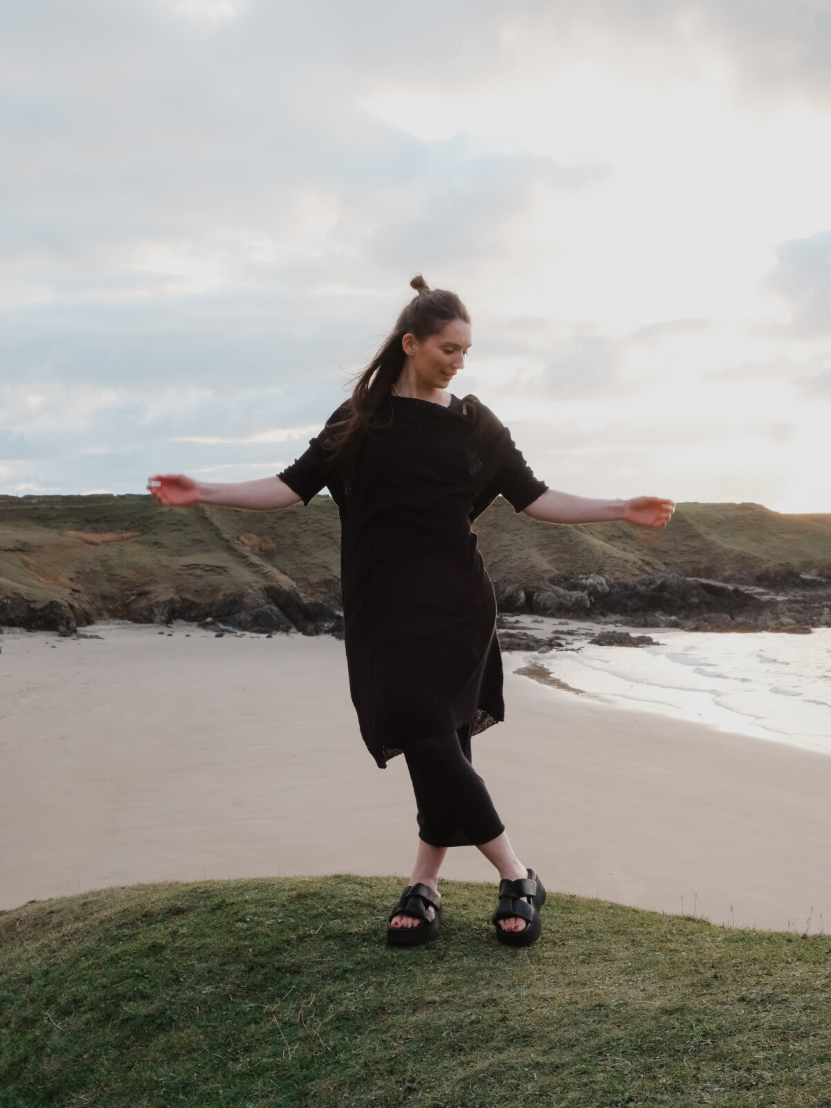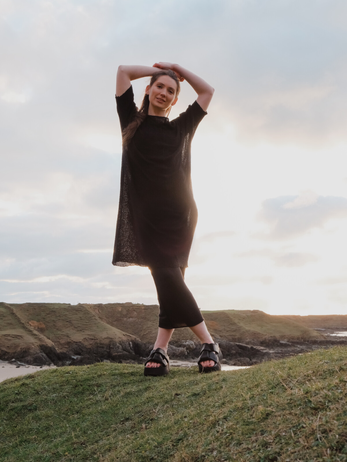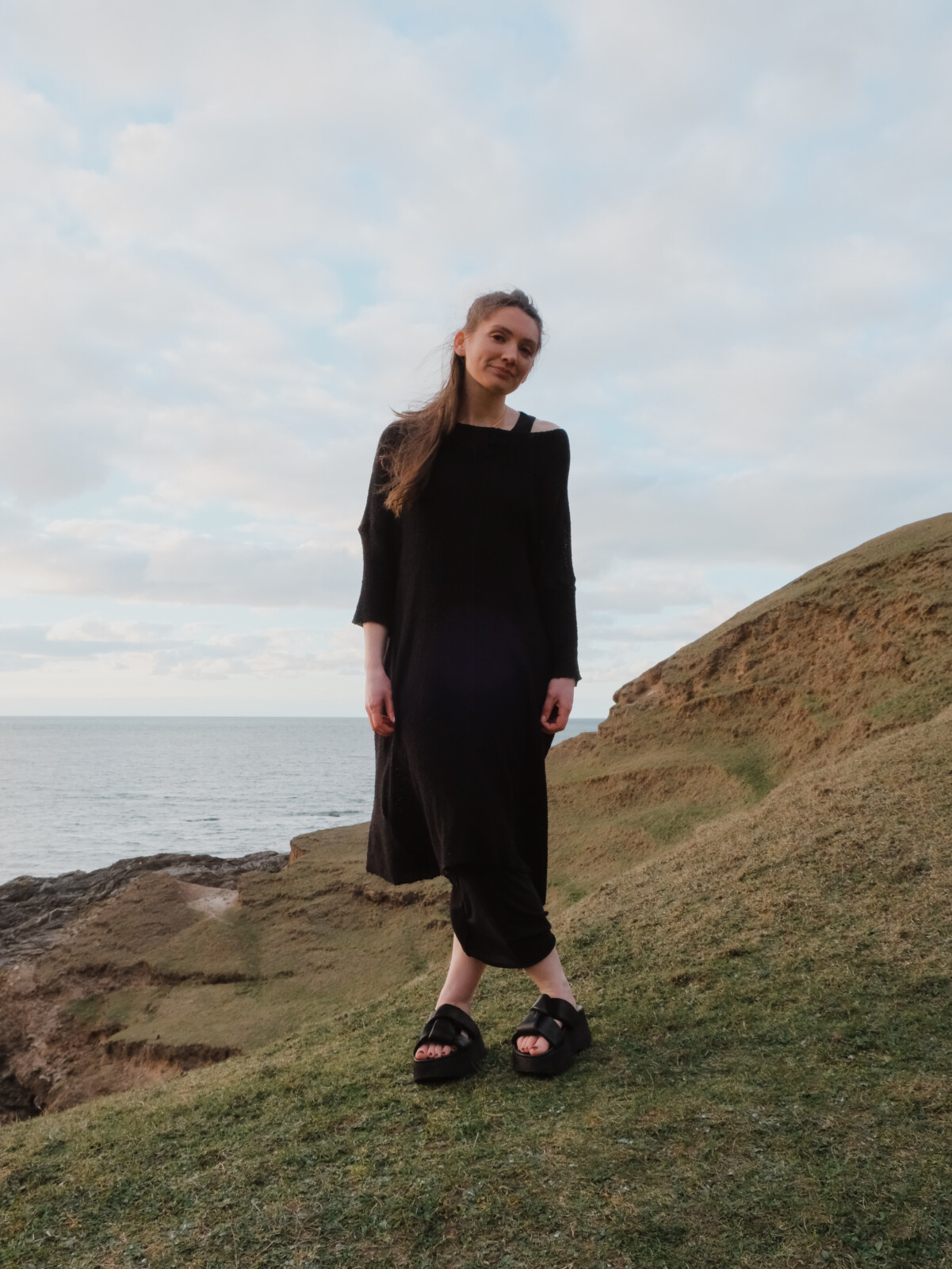 The Sort Aarhus black knitted dress features a relaxed silhouette with a wide neckline for effortless draping. Its lightweight, semi-sheer knit adds a touch of texture and movement, making it an ideal layering piece. Styled here with the Sort Aarhus Boxer Dress underneath, this versatile look embodies understated sophistication with a contemporary edge.