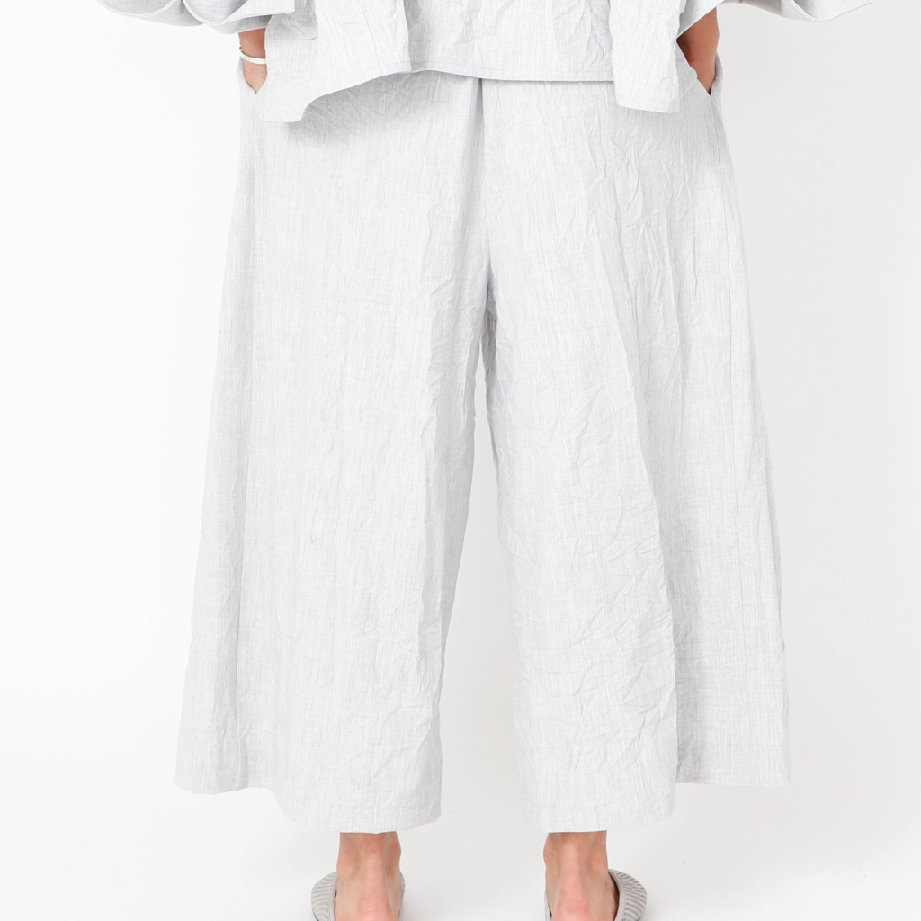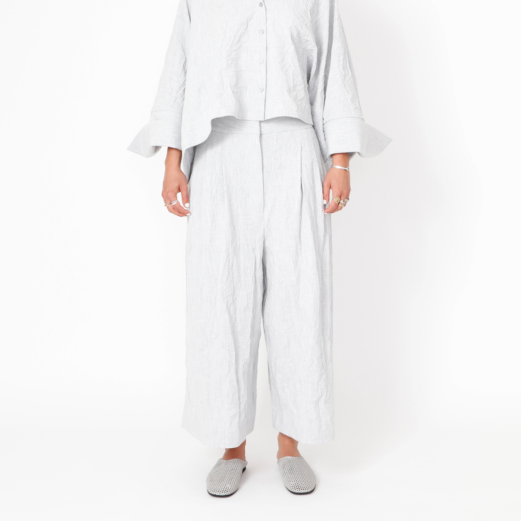 High-waisted trousers with wide 3/4-length legs, featuring a zipper and button closure and practical pockets. Made in Portugal from carefully selected local materials, designed for comfort and an easy fit.