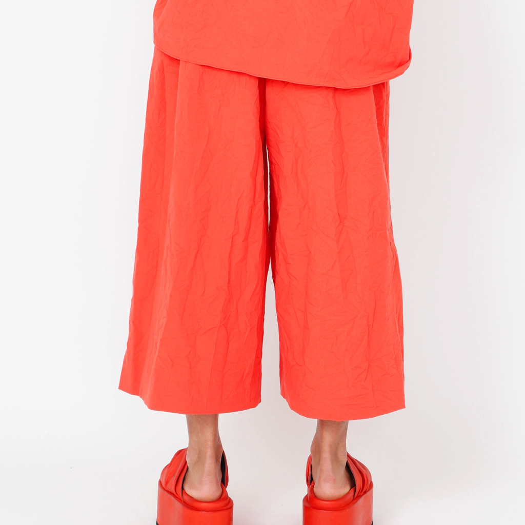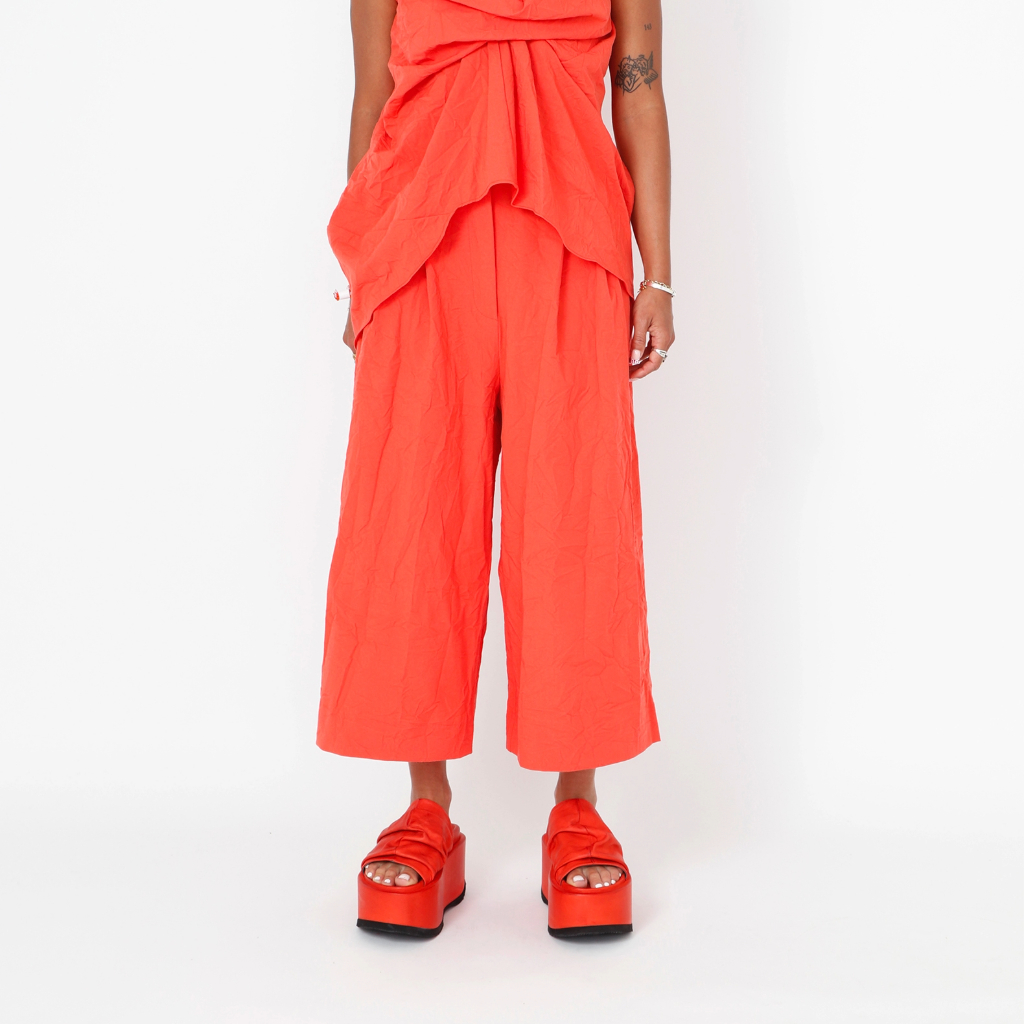 High-waisted trousers with wide 3/4-length legs, featuring a zipper and button closure and practical pockets. Made in Portugal from carefully selected local materials, designed for comfort and an easy fit.