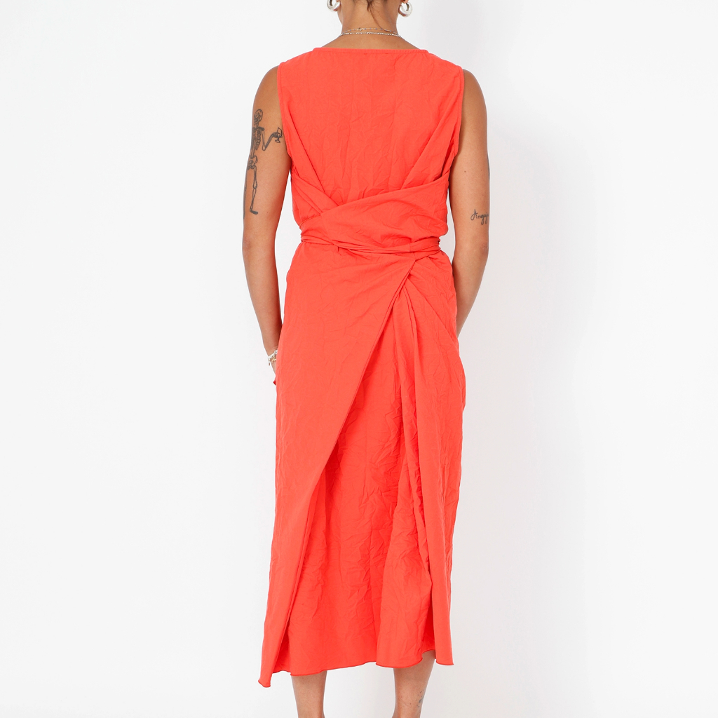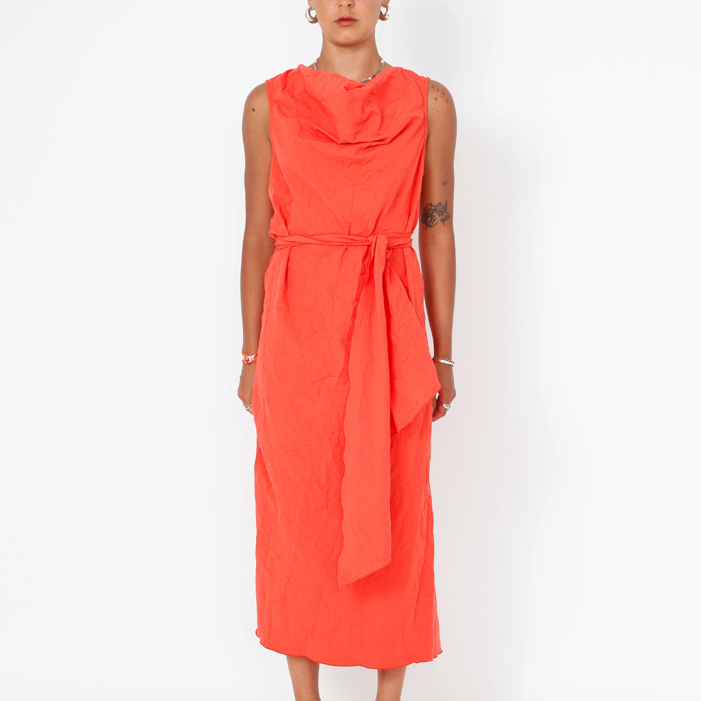A flowing long dress with a waist tie and a soft, feminine neckline. Crafted from a comfortable polyester–viscose blend for an easy, all-day wear. Perfect for everyday styling or dressed up. Composition 66% Polyester, 28% Viscose, 6% Elastane