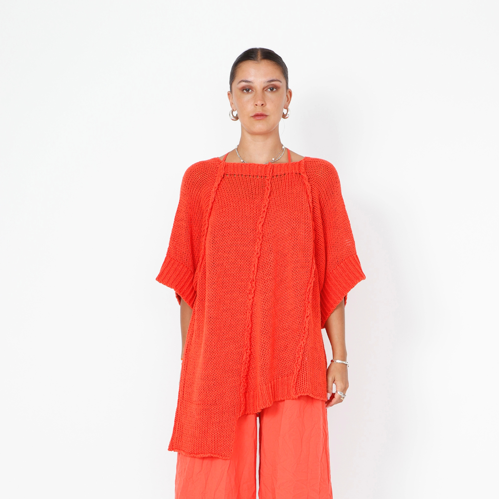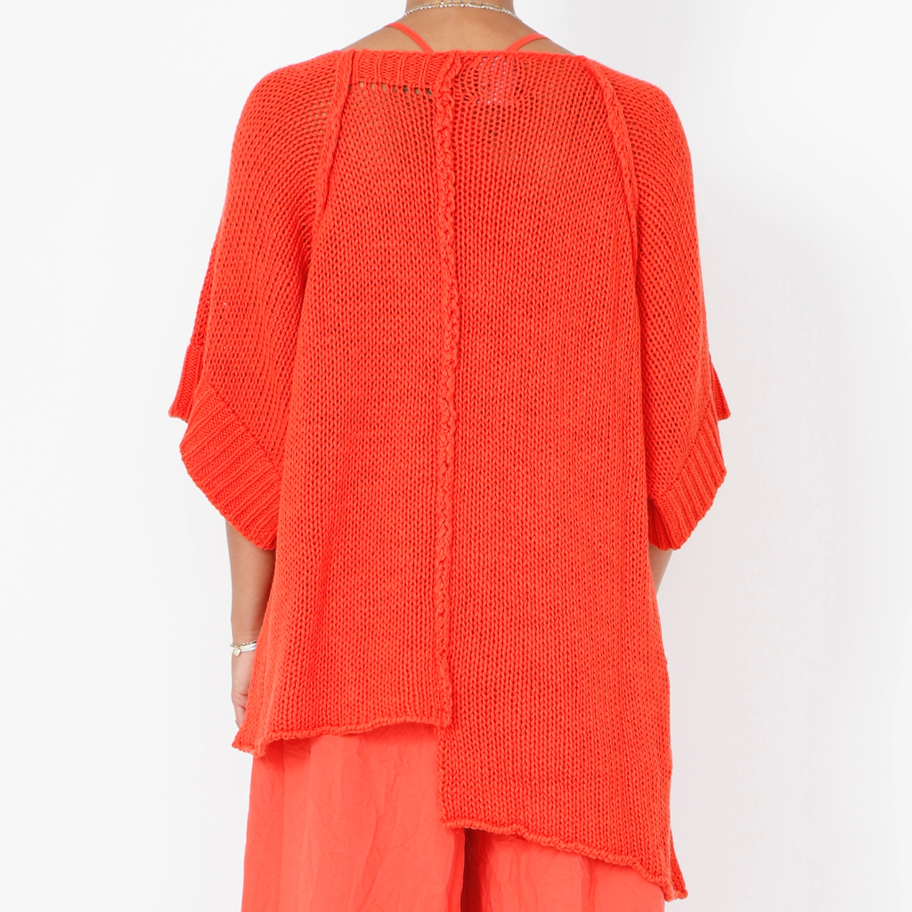Oversized loose knitted blouse made in a soft mix of cotton and linen. The blouse has wide rib by the sleeve-ends and an asymmetrical cut.