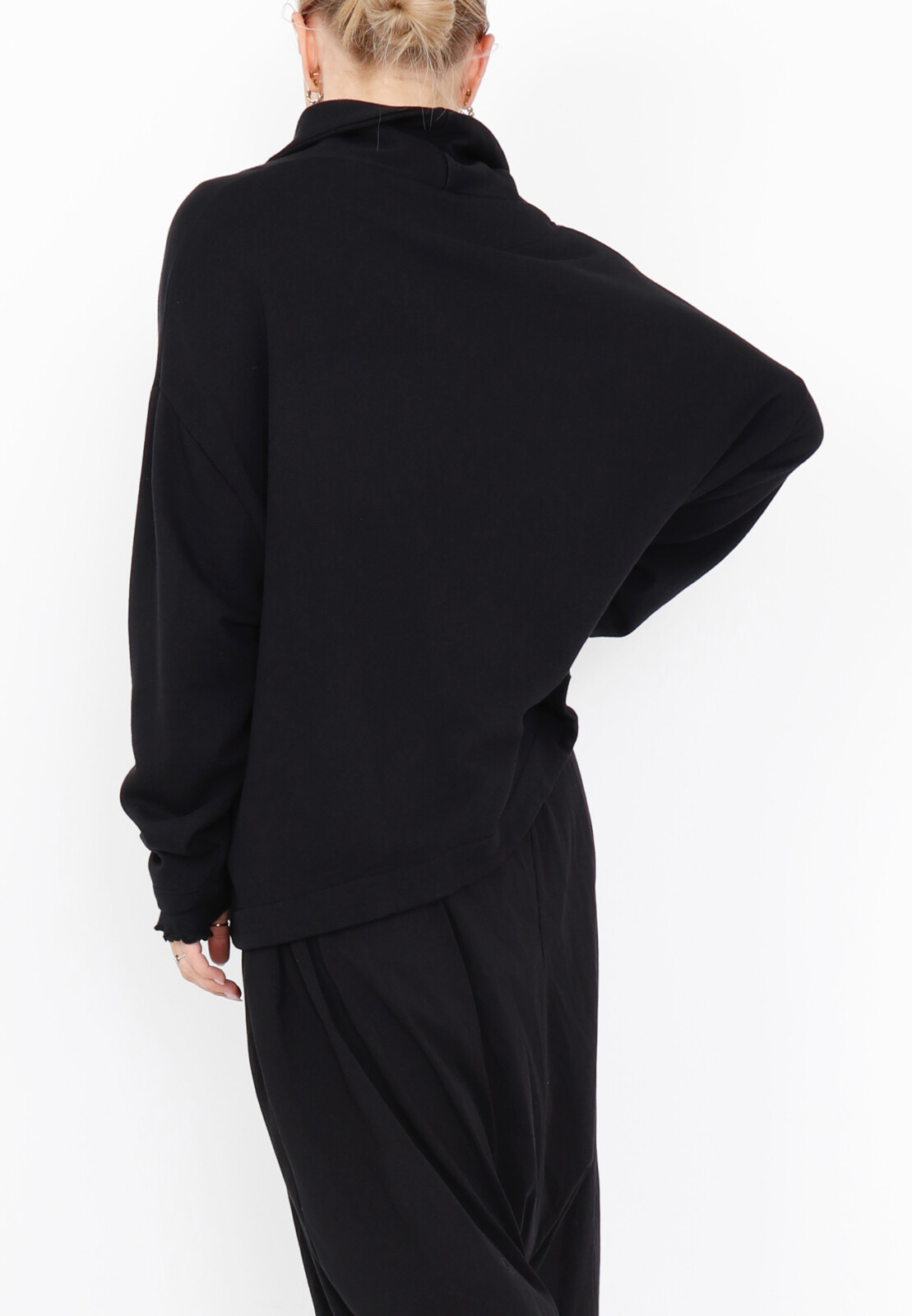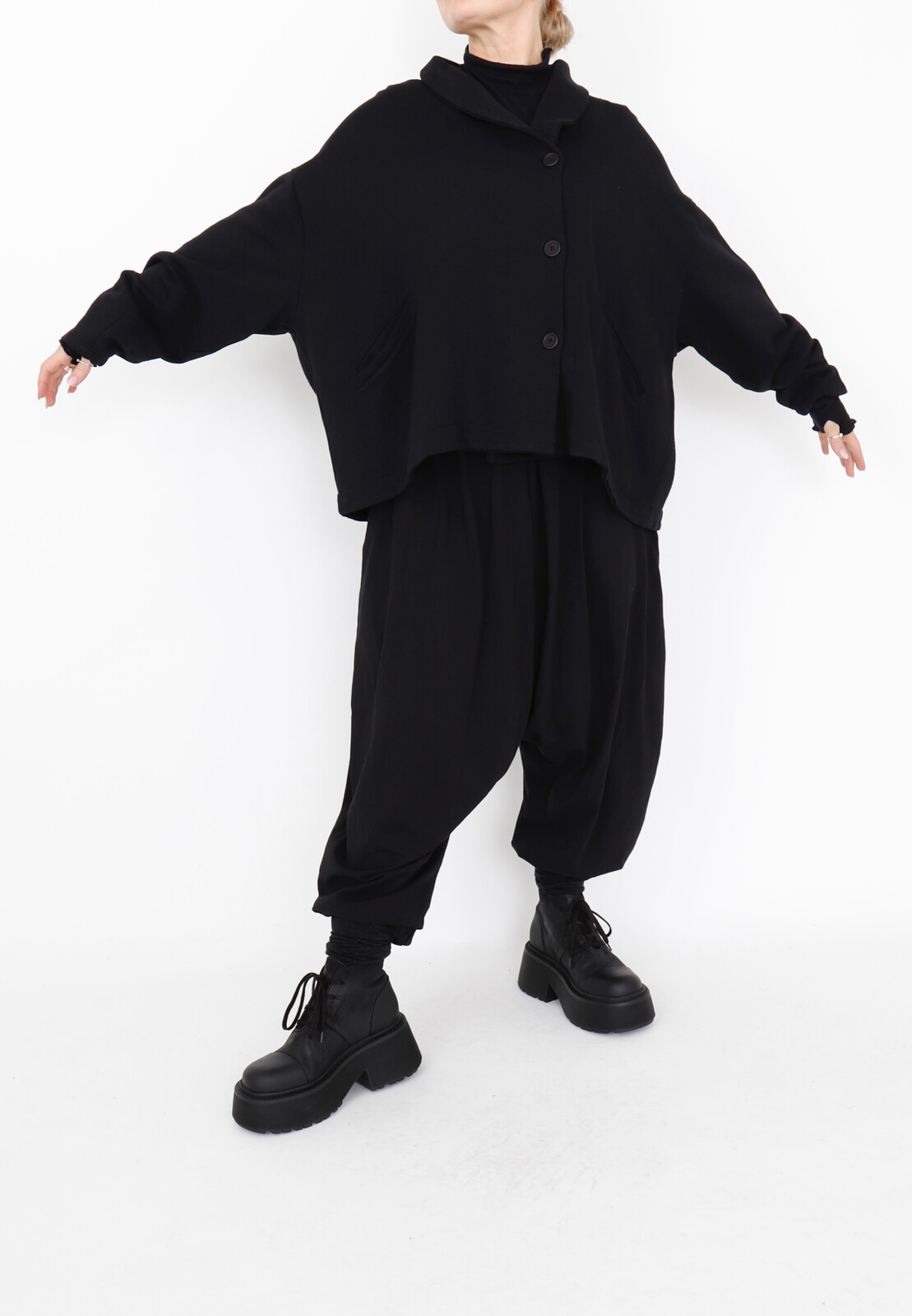 Oversized cardigan from Sort Aarhus in soft sweatshirt fabric with front buttons, small collar, and side pockets – wear closed as a sweater or open for a relaxed layered look.