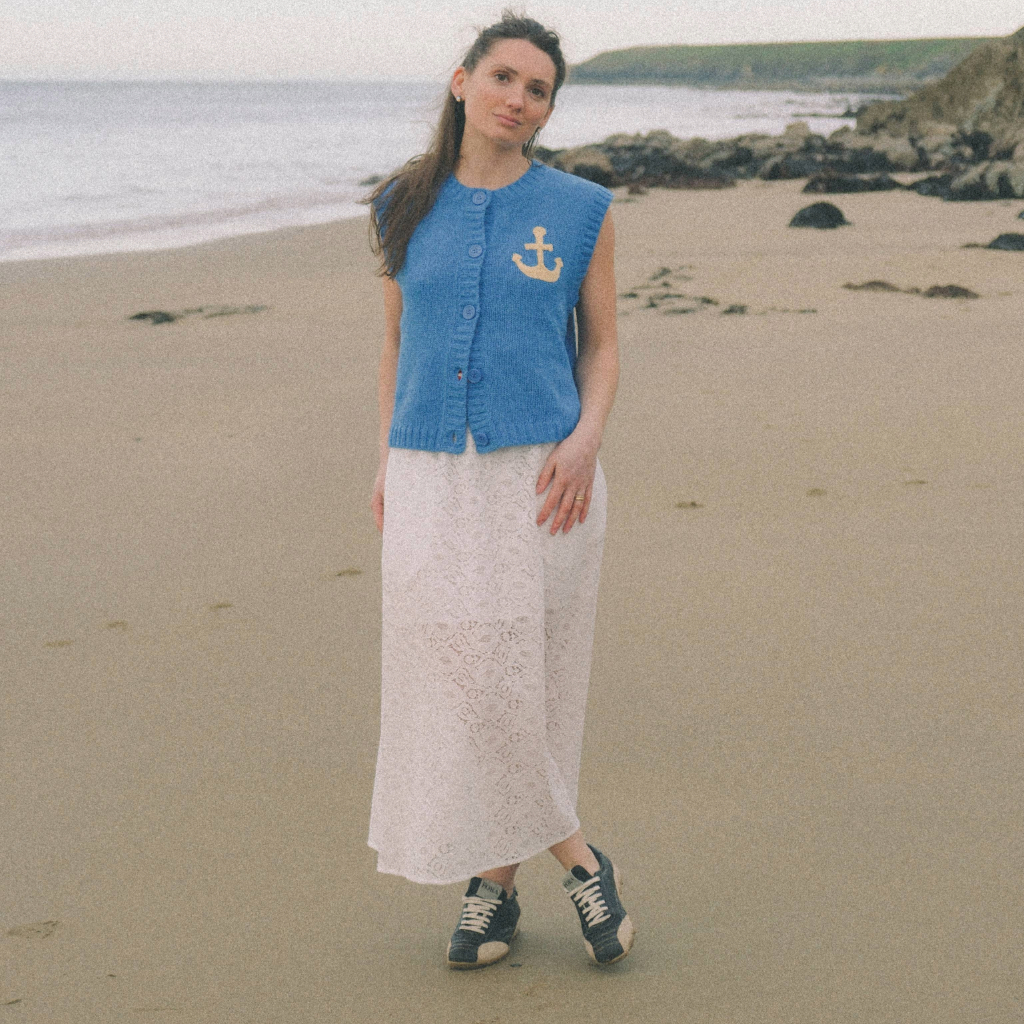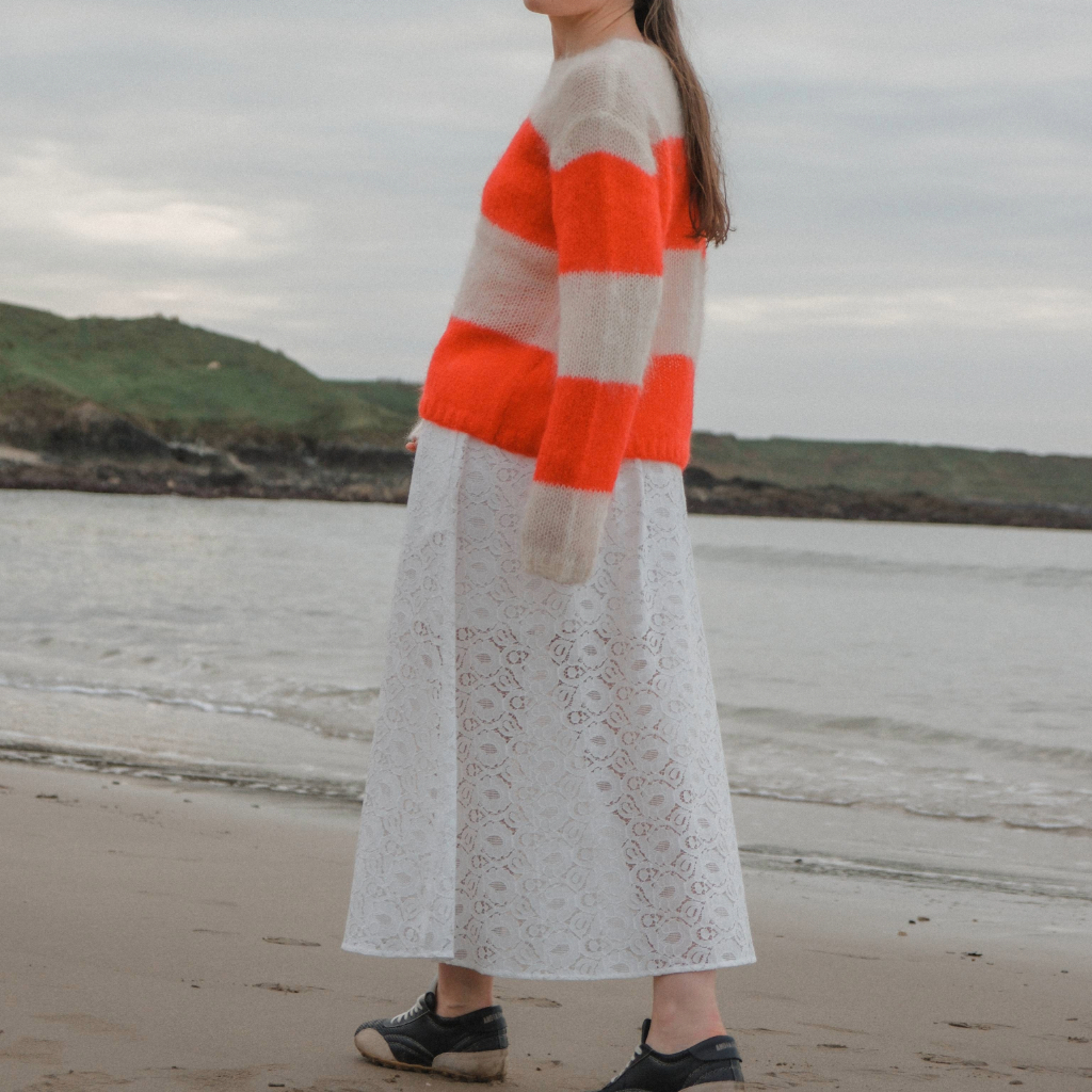 Stella Nova midi-length lace skirt with an A-line shape. Finished with a lining for comfort and coverage. Features an elasticated waist.