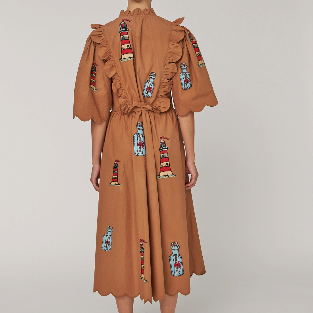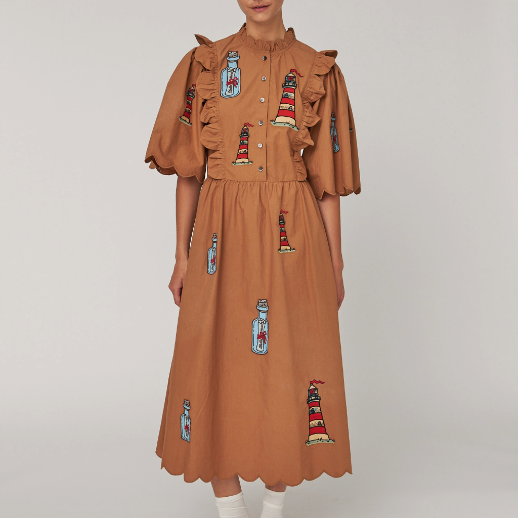 Midi dress with front button closure and ruffled round neckline. The dress features embroidered motifs and ruffles on the shoulders. The sleeves are three-quarter length with scalloped edges, and the skirt has a matching scalloped hem. Tie band at the back waist.