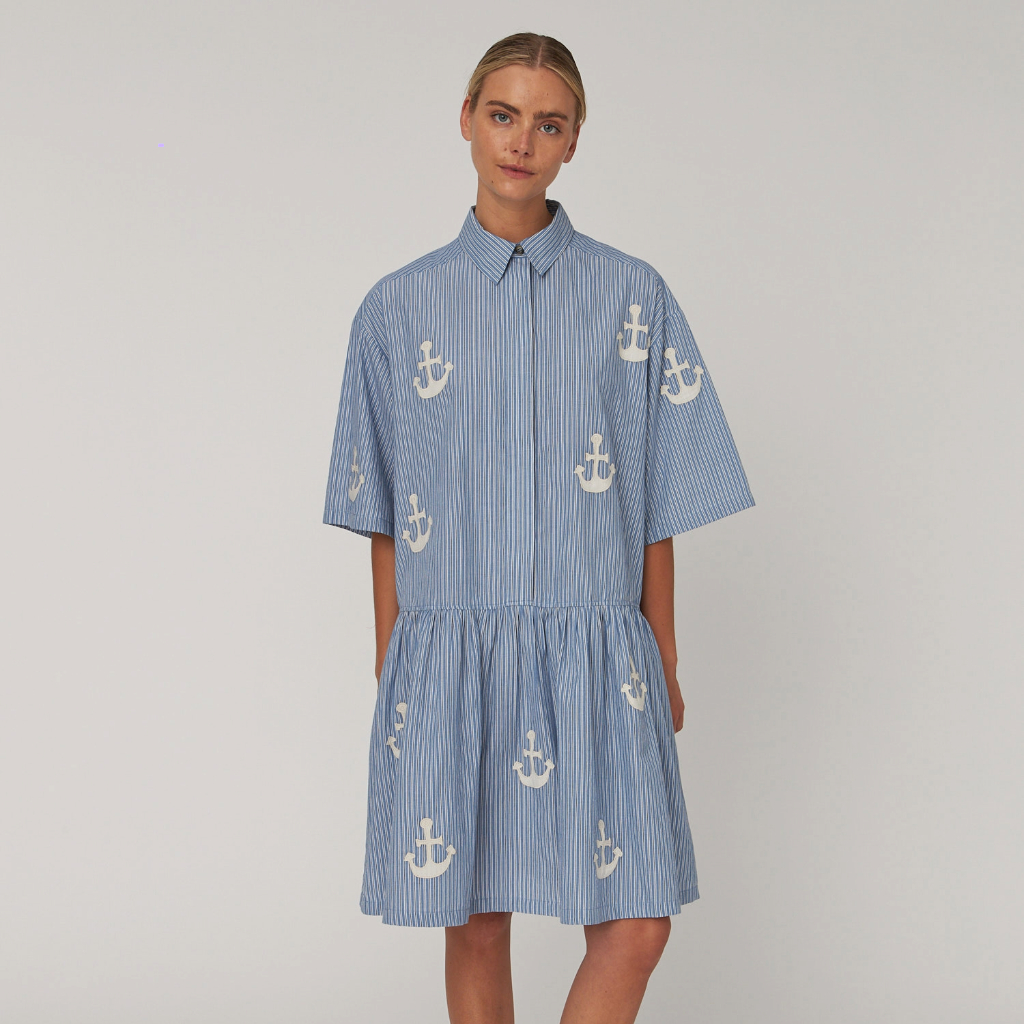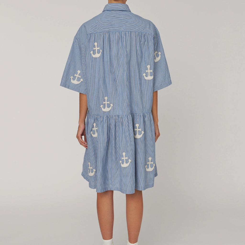 Midi dress in cotton striped fabric with embroidered anchors. It features a classic shirt collar and a concealed button closure at the front. The dress has short sleeves and a loose fit with a waist seam that adds volume to the skirt.