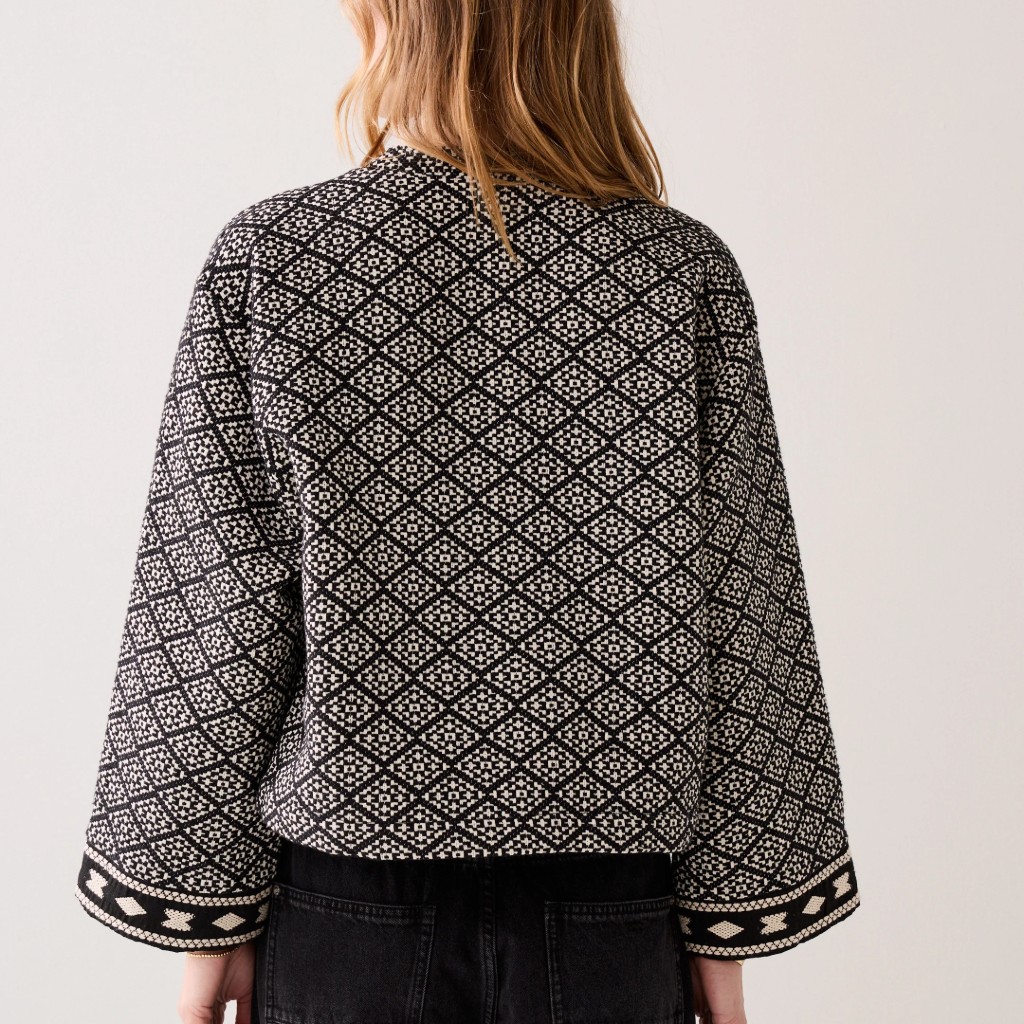 Reversible kimono jacket in a sturdy jacquard with a rich woven texture. Features contrast colours, wide straight sleeves, and a lightweight transparent lining.