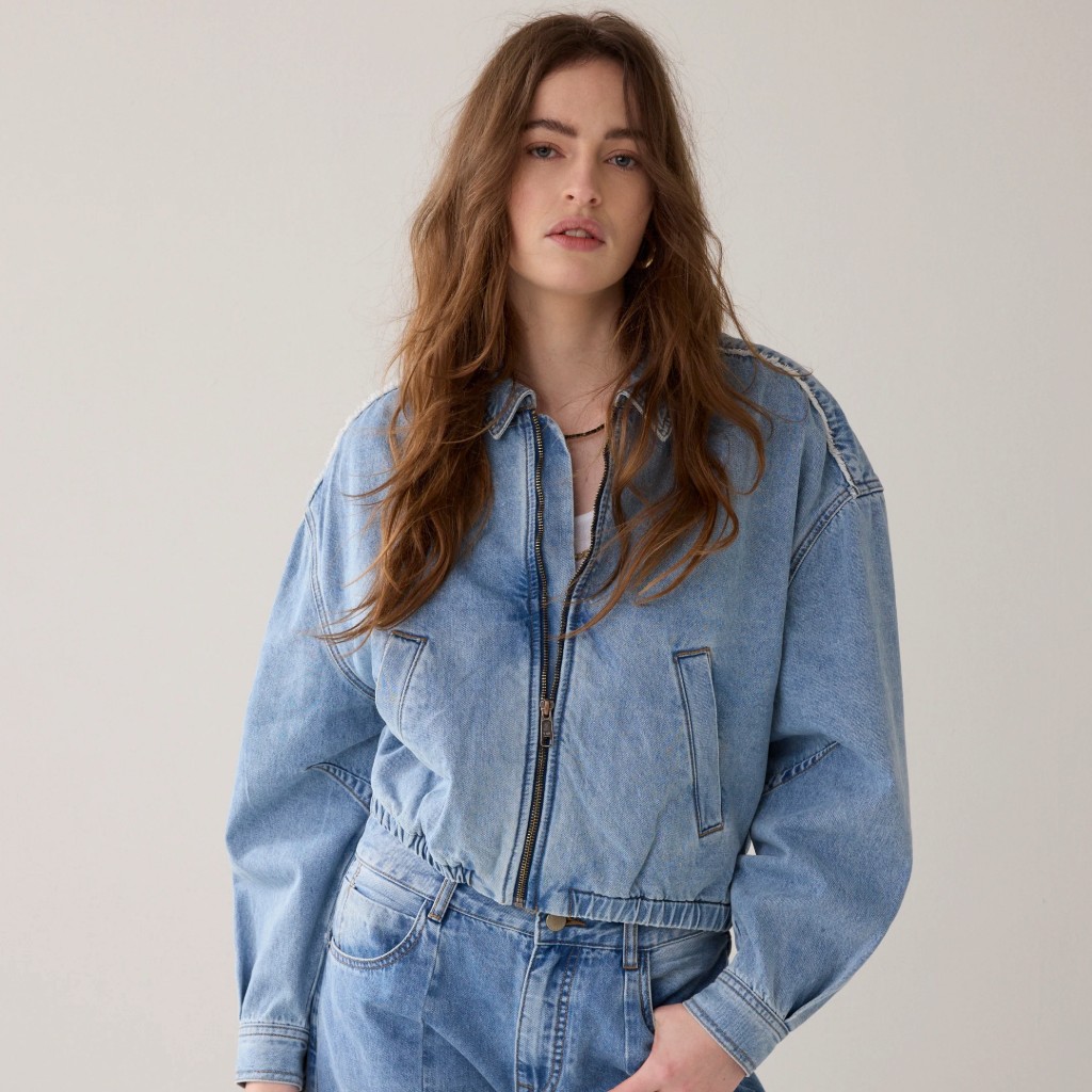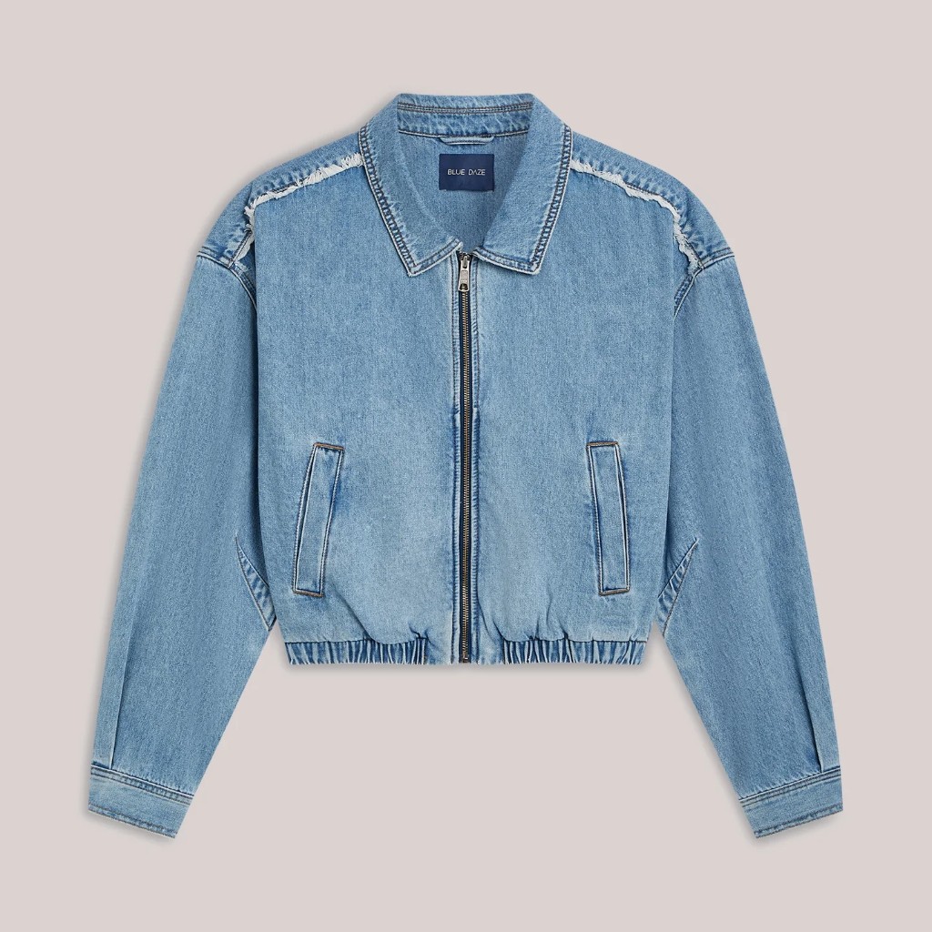 Denim bomber jacket made of 100% cotton in stonewash. This item has an oversized fit with raw edge details (deconstructed denim) and an elasticated waist. Features a zip and slit pockets.
