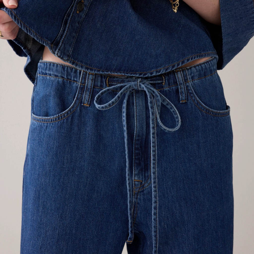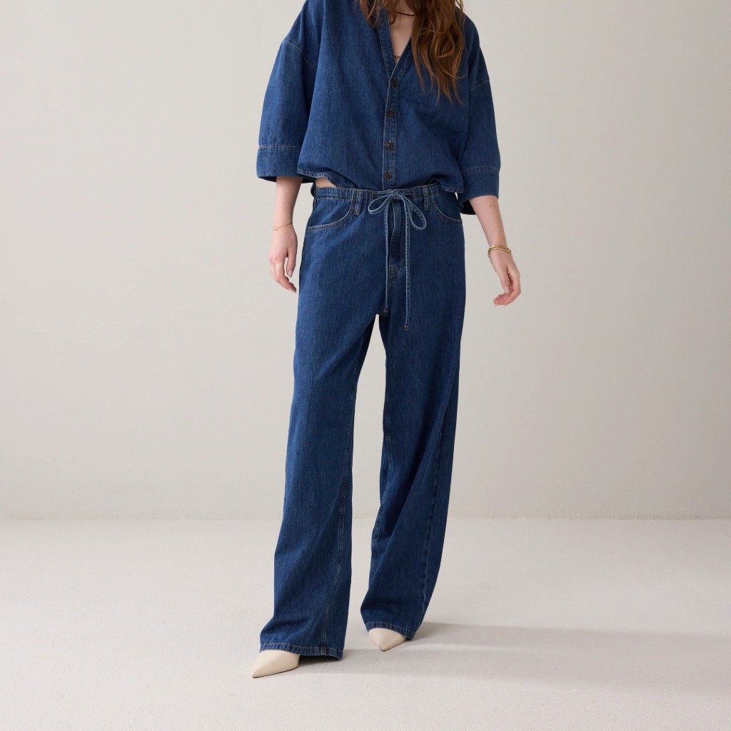 Trousers in supple, lightweight denim with straight legs. They trousers have a loose fit and an elasticated waistband with drawstring fastening on the front for a comfortable fit.