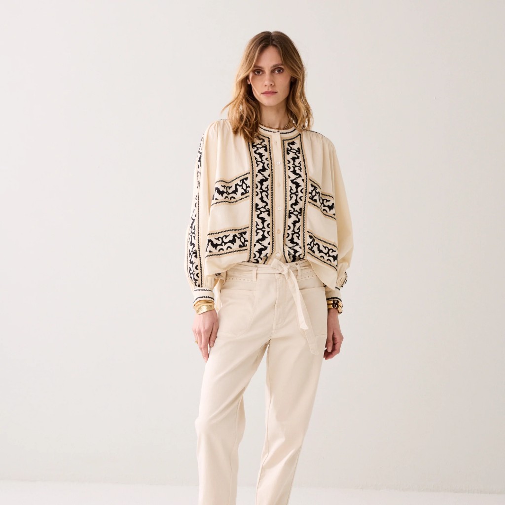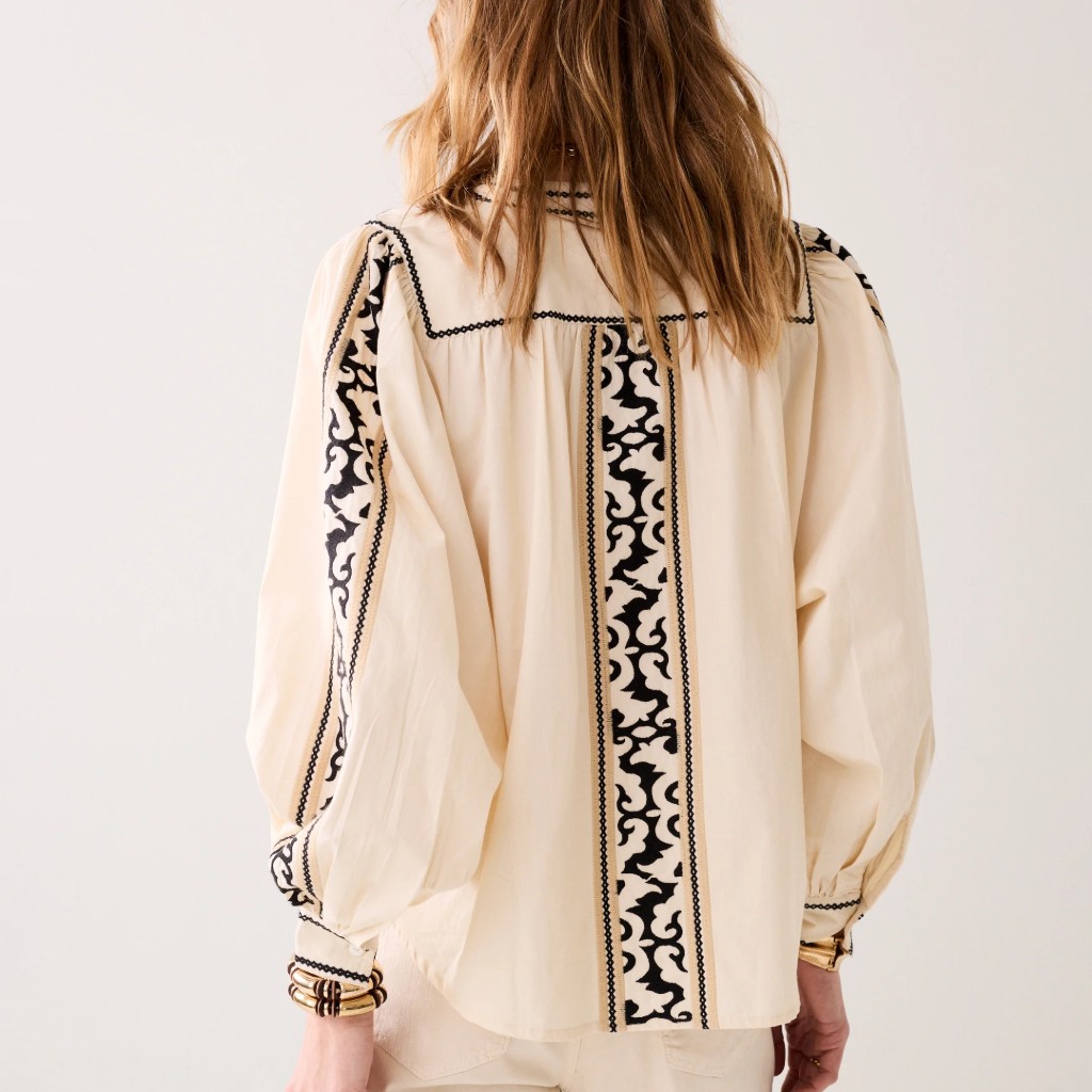 Cotton blouse with a crisp feel, loose boxy fit, and a slightly longer back. Finished with all-over embroidery, scallop shell buttons, and puff sleeves with fitted cuffs.