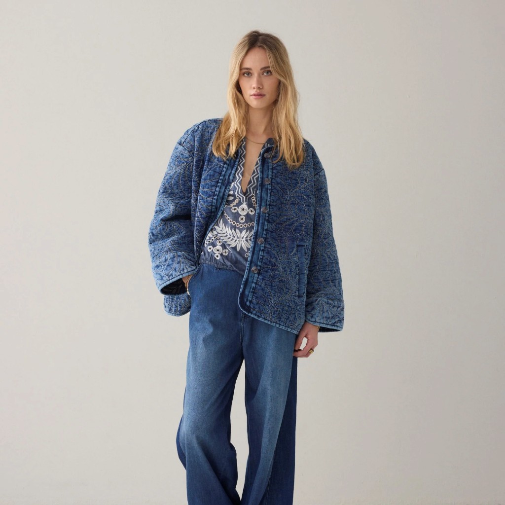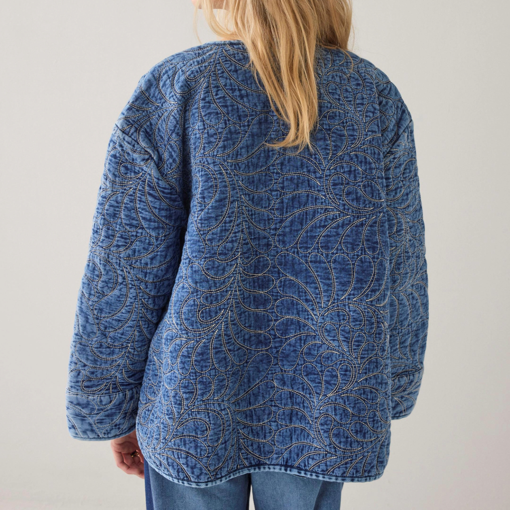 Quilted transitional jacket in soft cotton satin with a subtle leaf pattern. Designed with a straight fit, bone button fastening, and finished with slim denim cuffs for a modern touch.