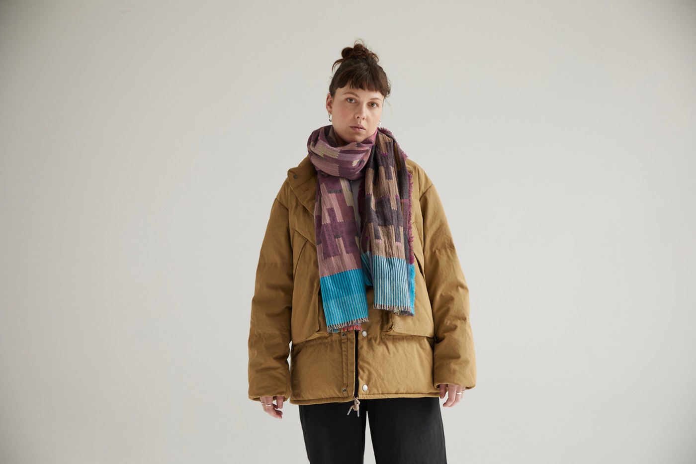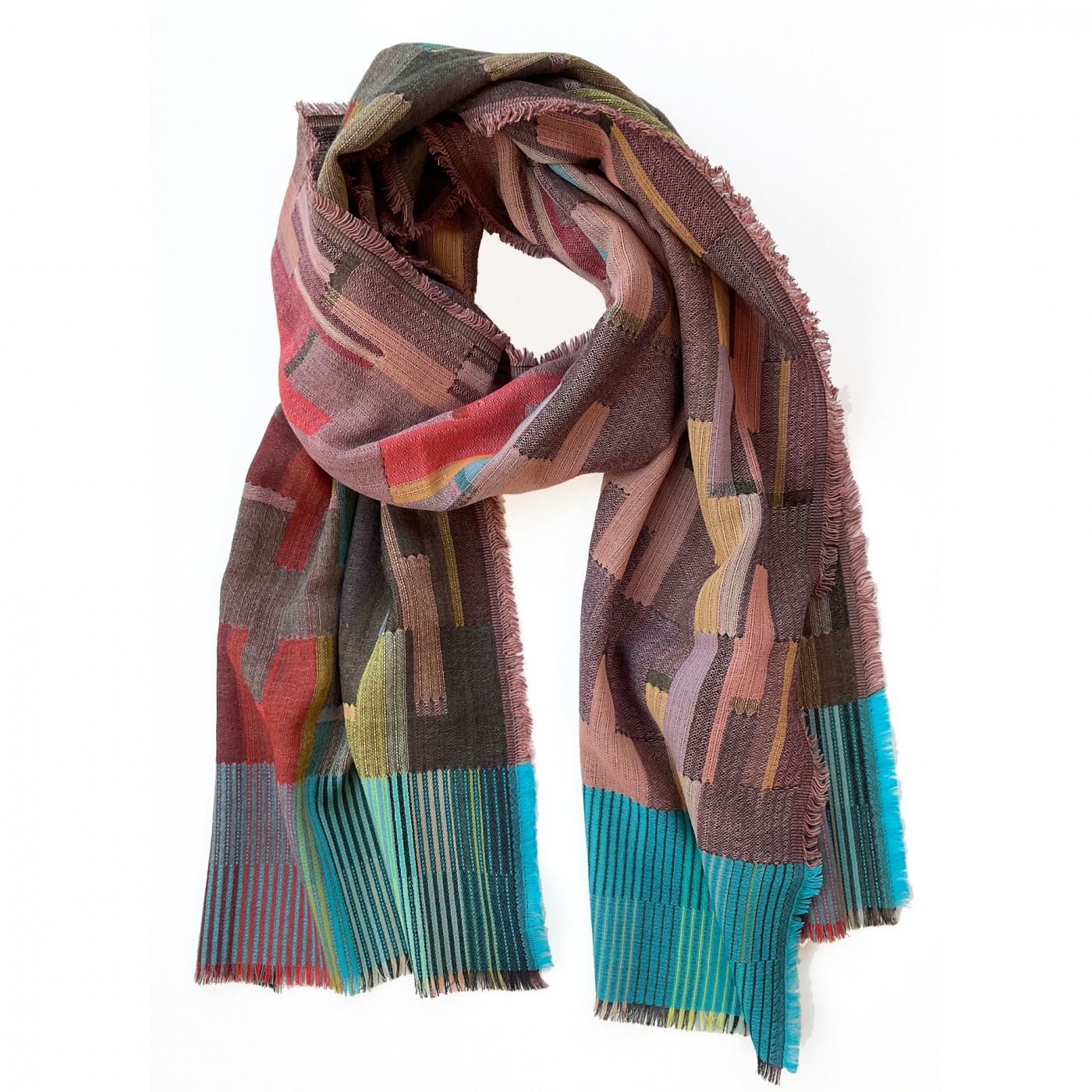 In a striking palette of salmon pink, soft brown, and a dazzling turquoise border, this elegant Wallace Sewell scarf is woven from fine wool with a bold geometric design. Double-sided for versatile styling, it offers two looks in one – lightweight yet warm, and beautifully refined.