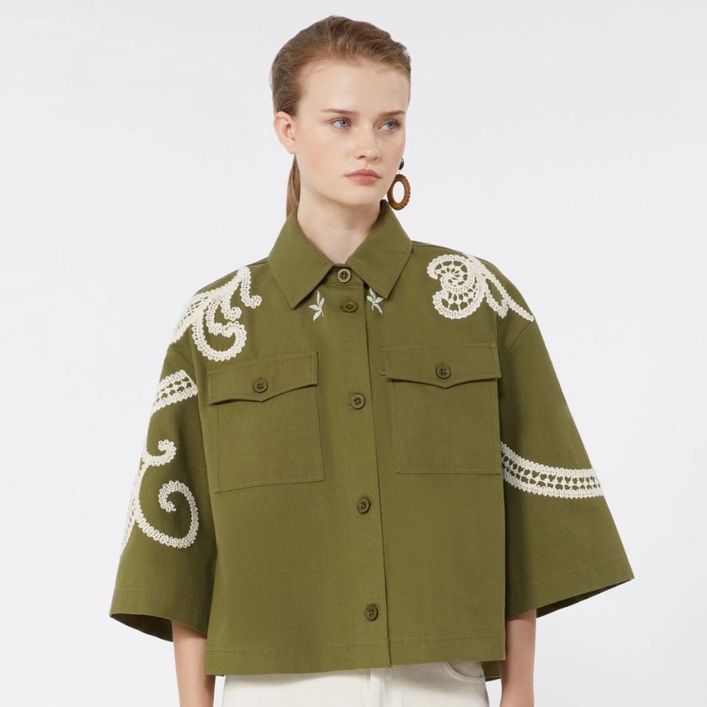 Shirt jacket, decorated with contrasting embroidery motif applied on the shoulders and sleeves.