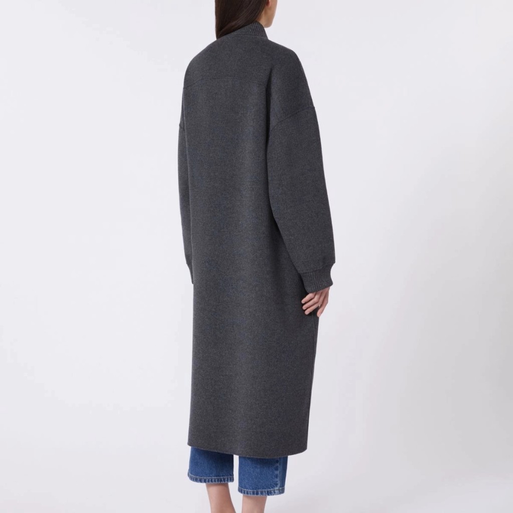 Long coat featuring a bomber-style collar and rib-knit cuffs.