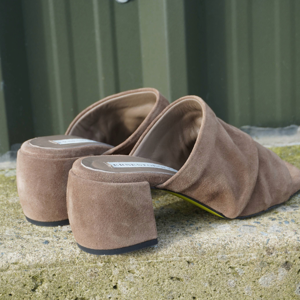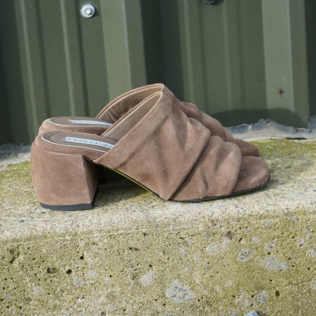 The Ernesto Dolani Nube sandals are made from antelope-coloured suede with a lime green sole. They feature a block heel, open toe, and a ruched detail strap. Padded and comfortable. Made in Italy.