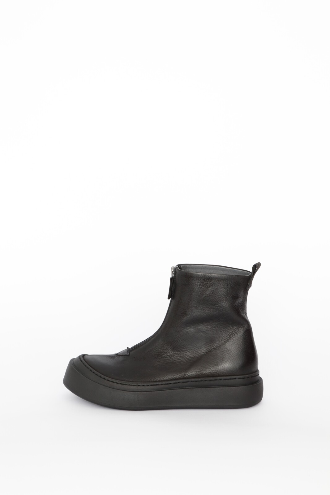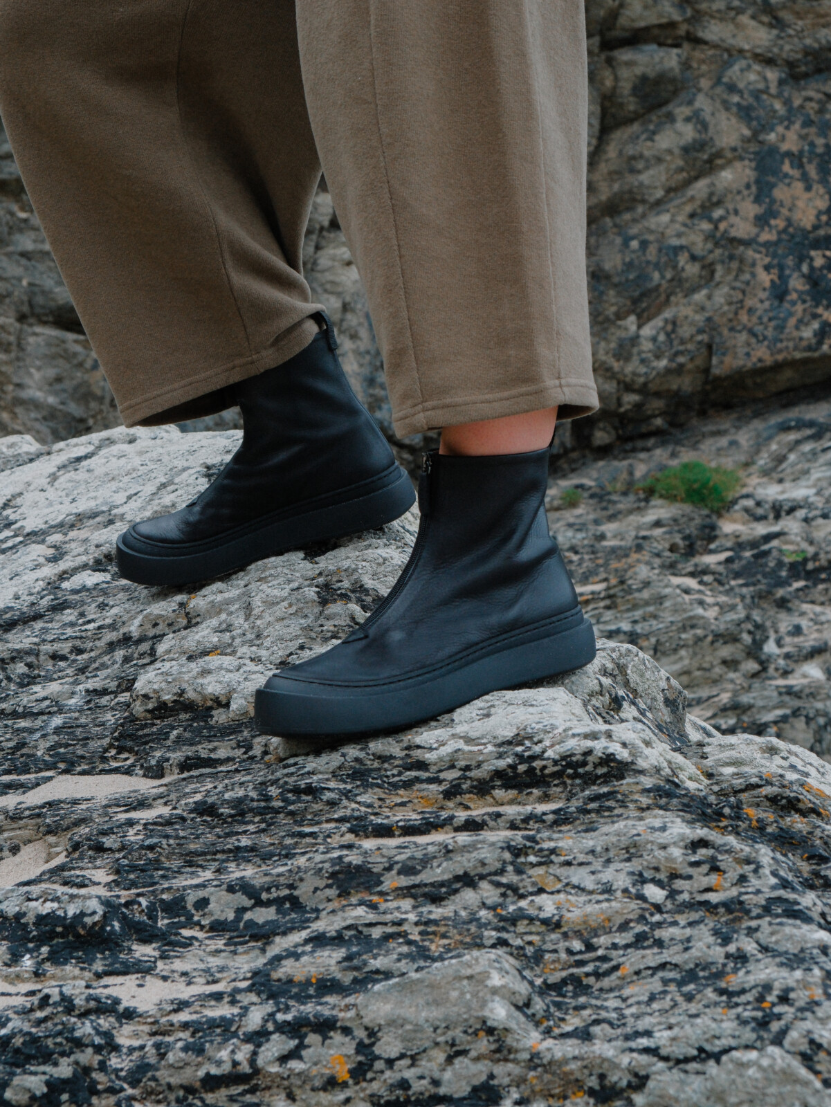 Sleek black leather boots from Lofina. Designed with a distinctive front zipper and a clean, streamlined shape. The sturdy sole adds comfort and durability, making them ideal for all-day wear.