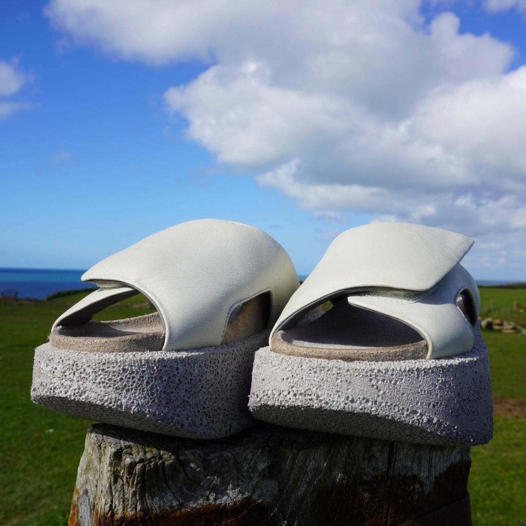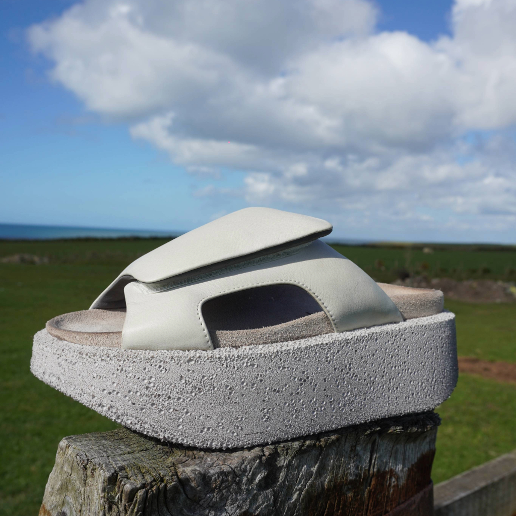 Leather platform sandals in a soft neutral tone, featuring a wide strap and sculptural sole. A modern, understated style designed for everyday comfort.