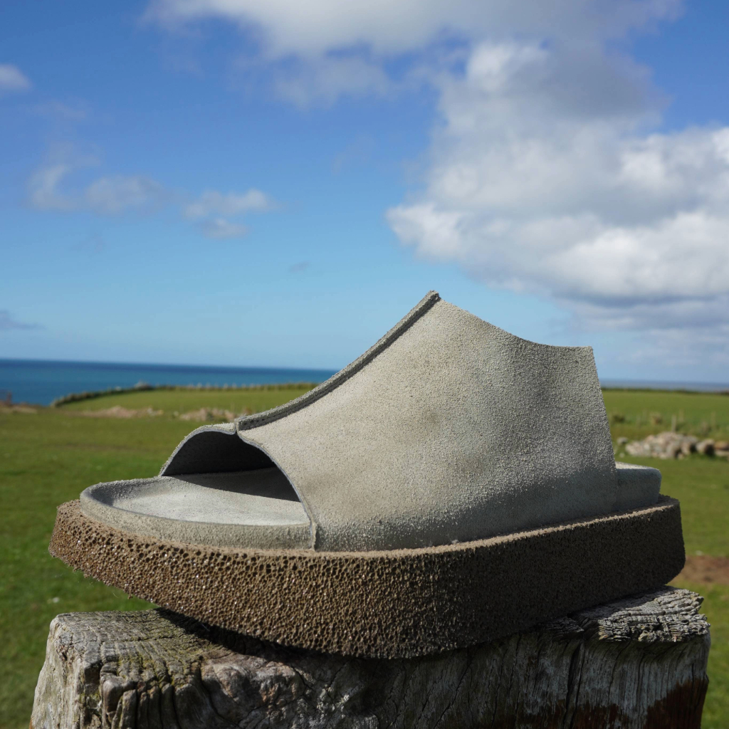 Suede platform sandal in a soft stone shade, with a simple, sculptural shape and textured sole.
