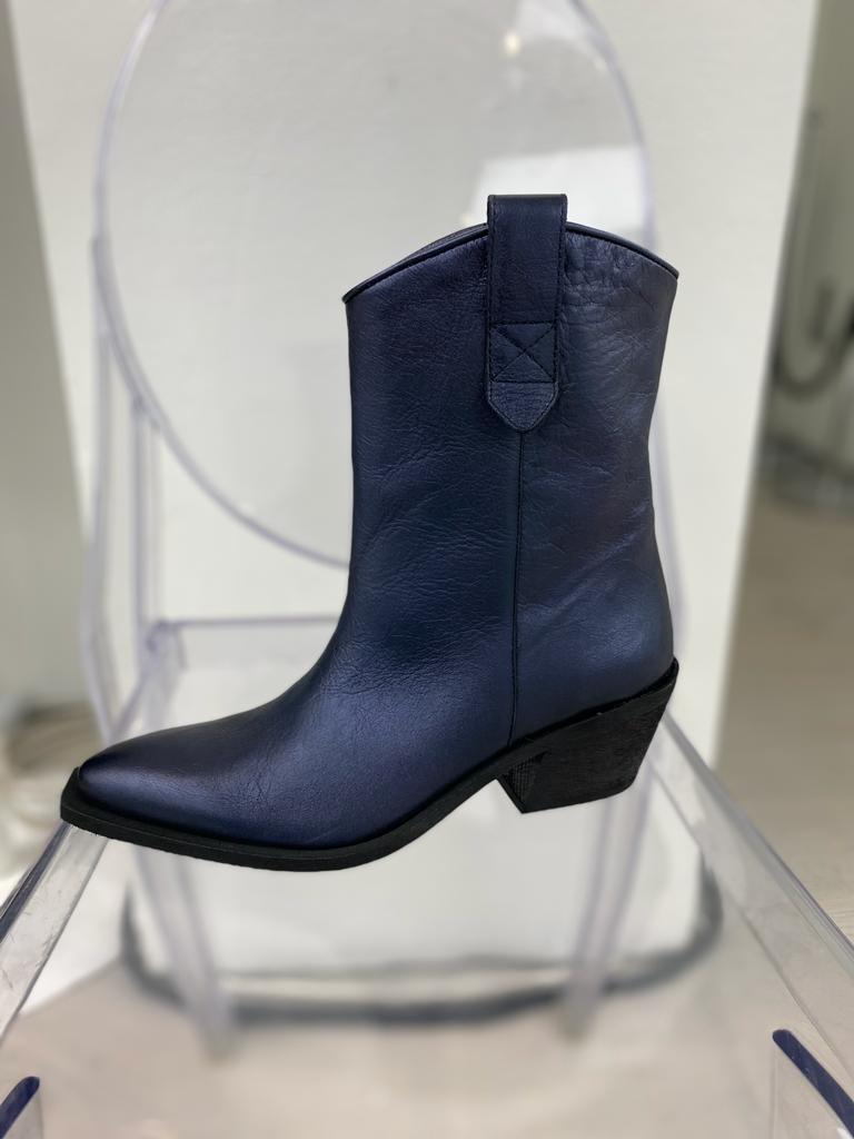 Pointed toes with square front sole Side pull on loop. Curved upper sides 2inch heel Side zip. Top stitching on side seam. Side zip. Leather upper. Rubber sole.