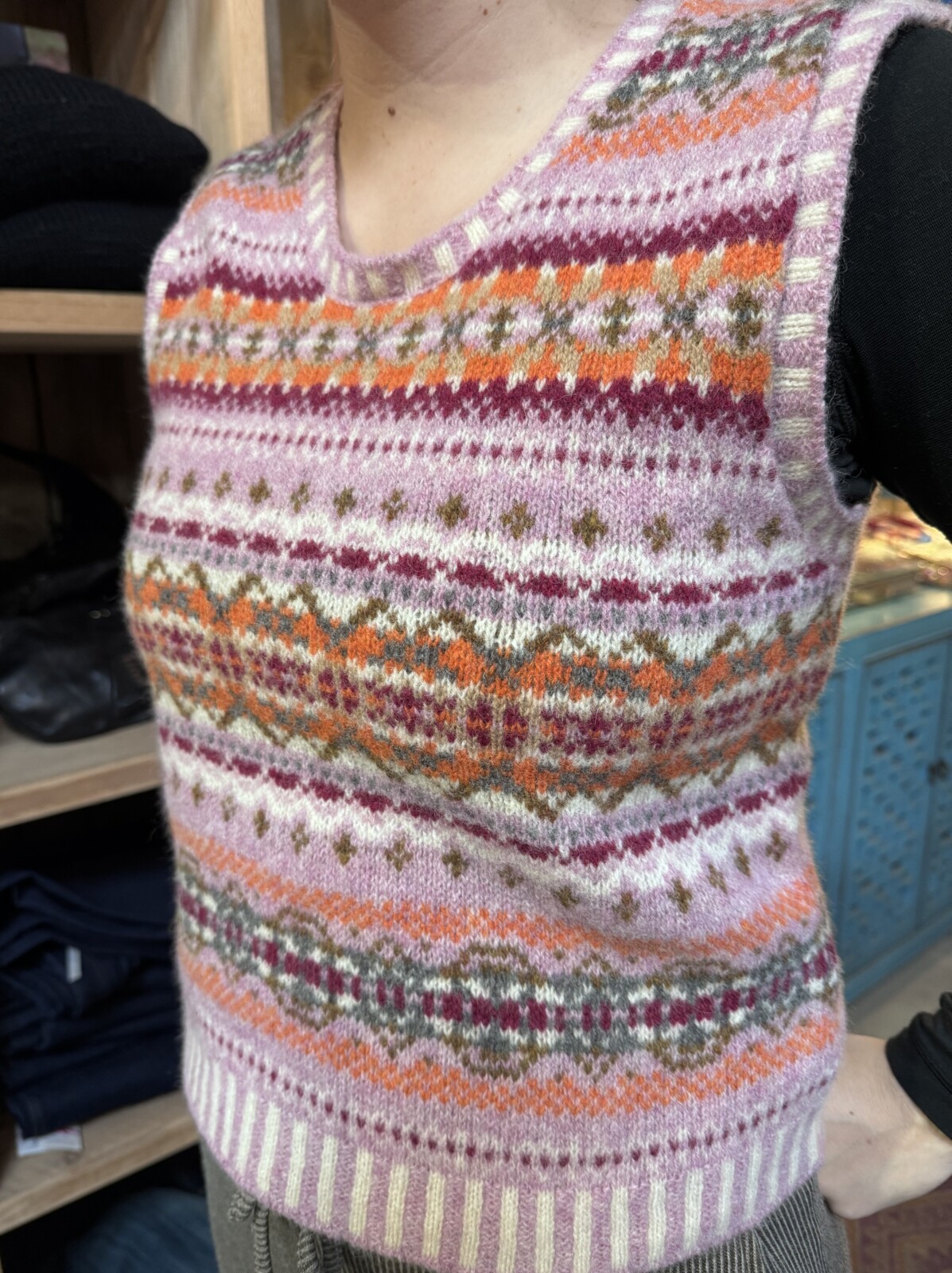 Inspired by Scottish Fairisle handknitted patterns, our modern low round neck vest features the classic striped rib hem. Knitted in Supersoft Shetland, it’s lighter and softer than traditional Shetland wool, ensuring comfort and a personalized fit over time.