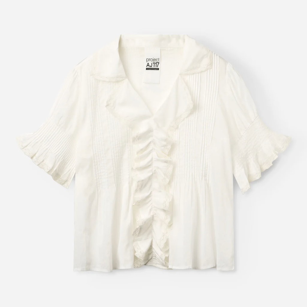 Gail is a feminine shirt made from soft organic cotton voile. It features delicate pintucks, a wide collar, flared sleeves, and ruffled details for a light, romantic look. The airy fabric feels soft and comfortable, making it easy to wear year-round.