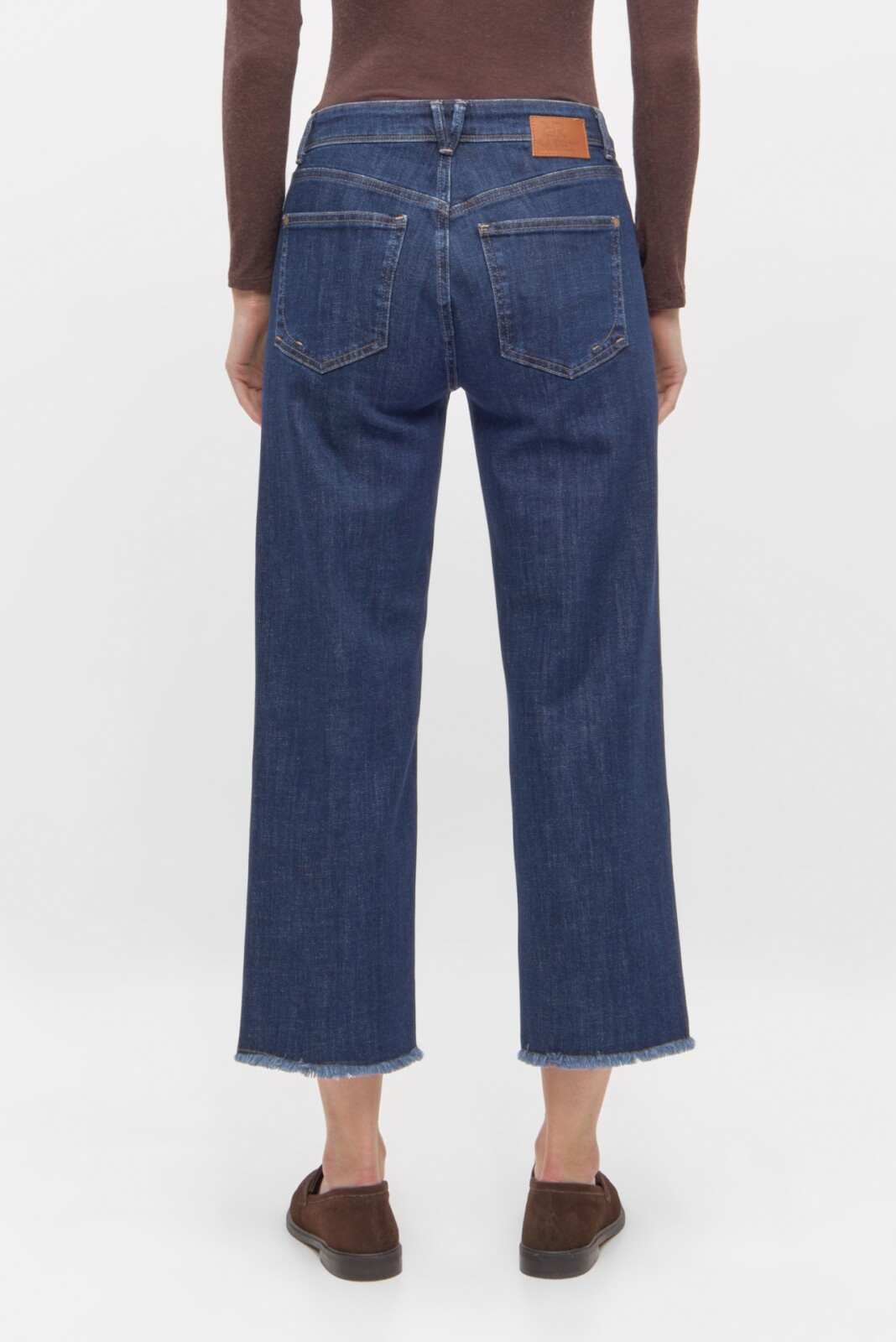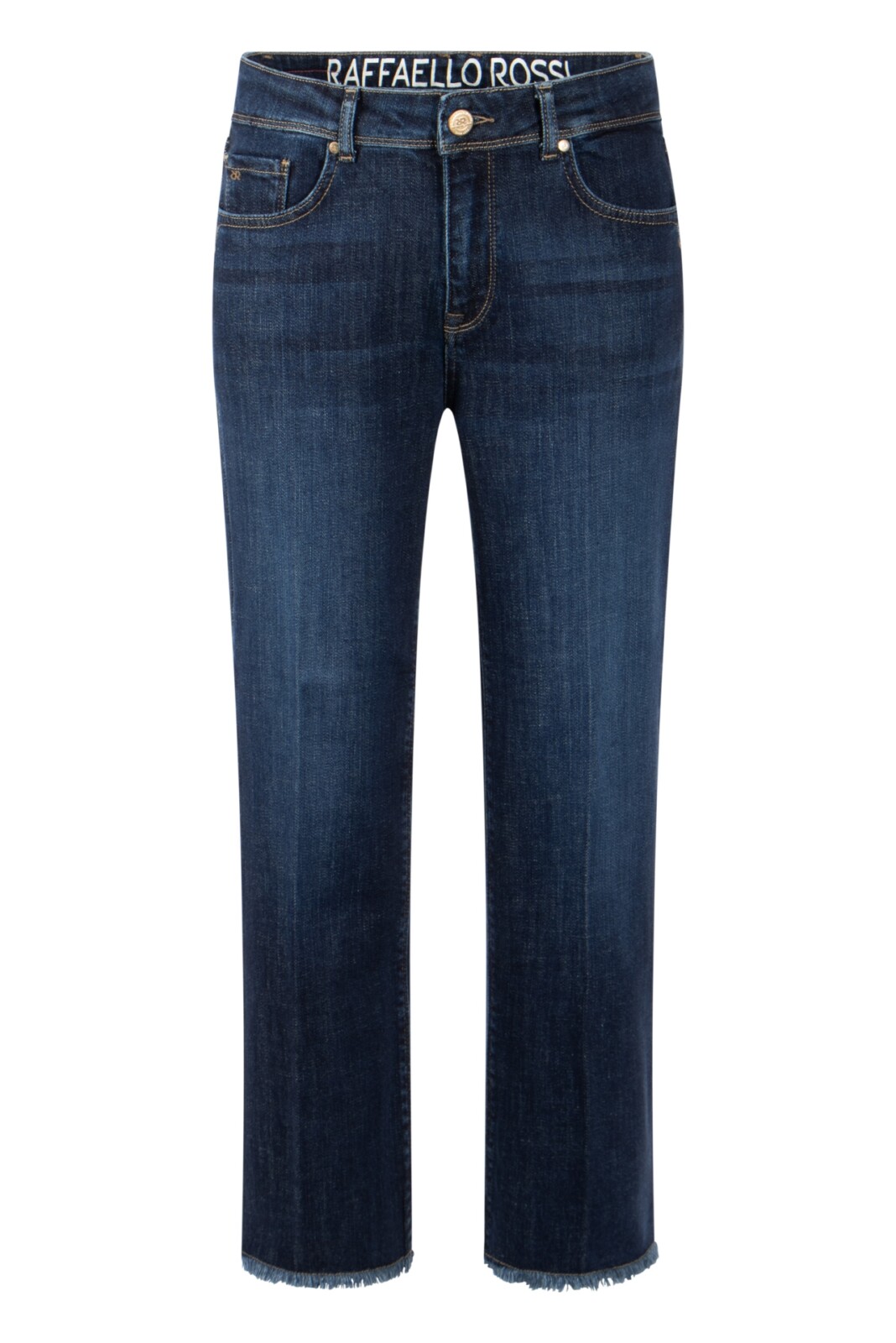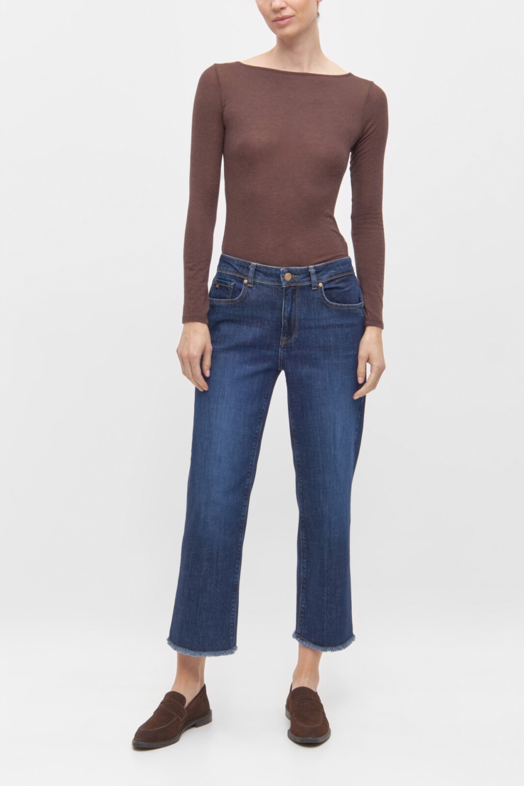 Mid waist 5-pocket style jeans with straight, loose, shortened leg.