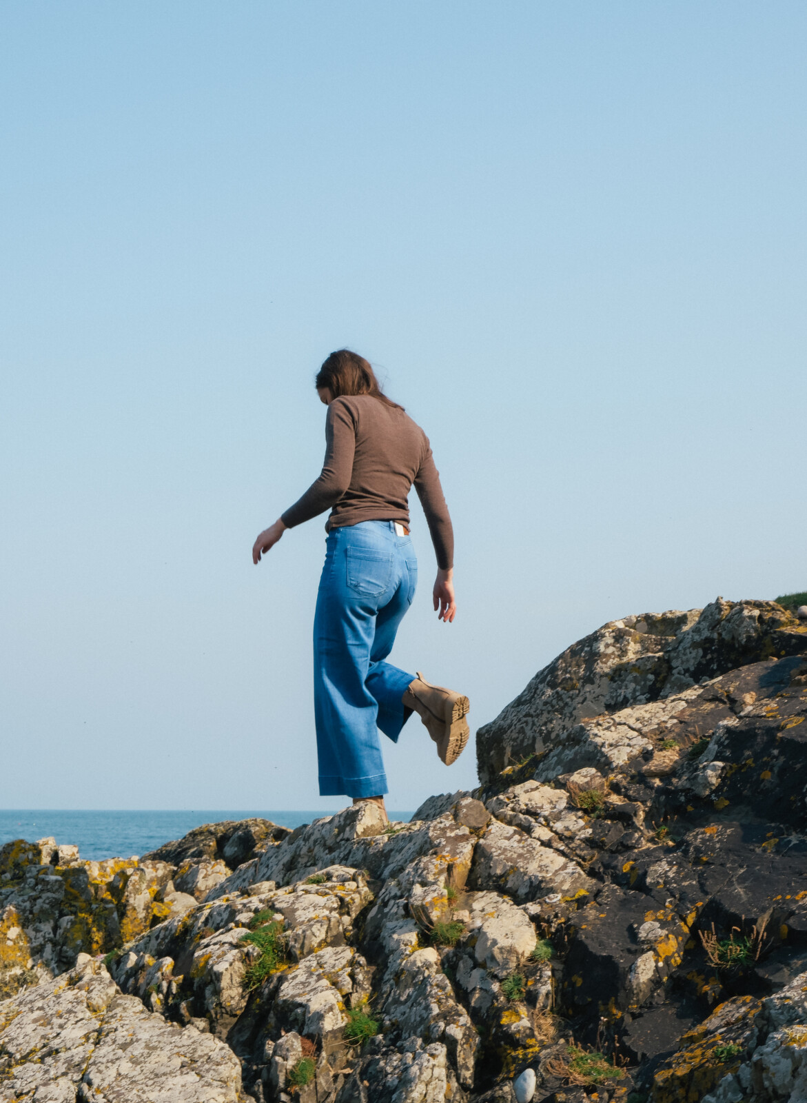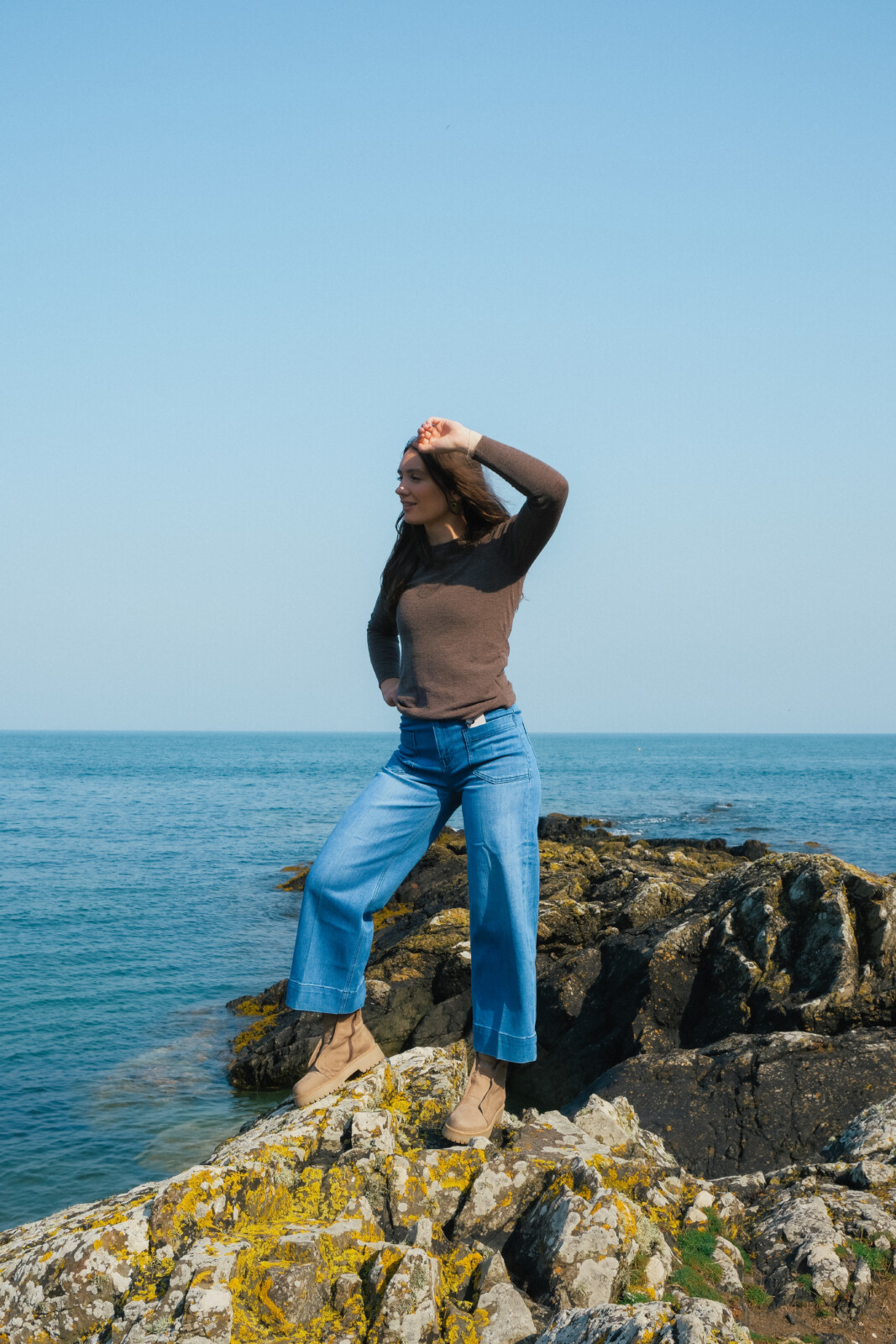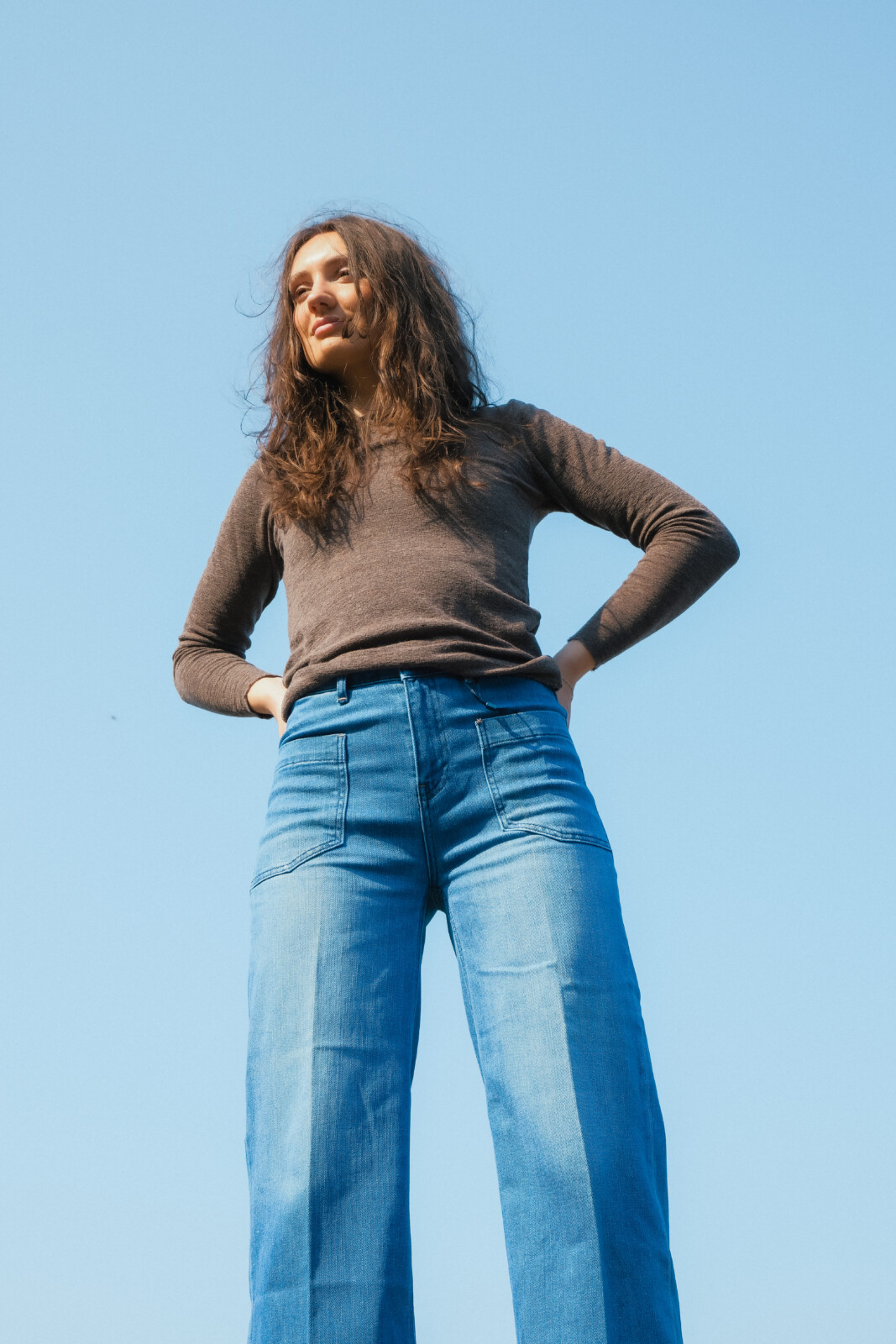 Elevate your style with our high-waist Miru jeans, featuring a wide, cropped leg and a bold, wide hemline. These jeans include front and back patch pockets.